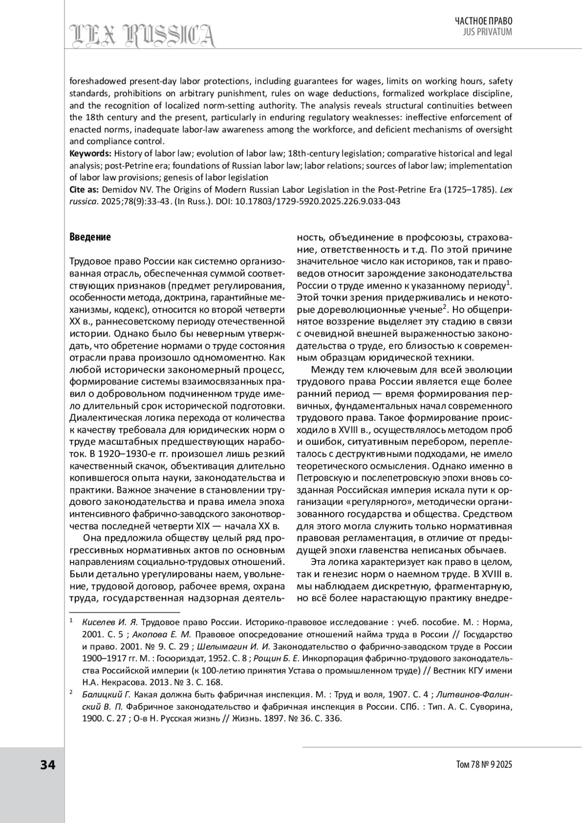 Средствами историко-правового, сравнительно-исторического, формально-юридического анализа исследовано формирование основ современного трудового права России в послепетровский период 1725–1785 гг. При известной временно́й отдаленности послепетровская эпоха важна выработкой ранних институтов, конструкций, подходов в сфере наемного подчиненного труда. В качестве методологической новации законодательства о труде XVIII в. названа позитивизация предписаний. Другой тенденцией стало укоренение публично-правовых начал в сфере труда. Допетровская государственность не вмешивалась в отношения нанимателя и нанятого, поддерживала цивилистическую конструкцию найма по соглашению сторон. В политике послепетровского периода утверждались черты актуального трудового права России, сущностью которого является соединение принципов частного и публичного права. Законодатель XVIII в. закреплял конкретные институты, которые стали элементами законодательства XXI в. Таковы гарантии в области оплаты труда, ограничение рабочего времени, нормы о безопасности работников, запрет на нелимитируемое применение наказаний, правила о денежных взысканиях (удержаниях), регламентация дисциплины труда, локальное нормотворчество. Сделан вывод о наличии родственных для двух эпох недочетов регламентации отношений по труду: таковы неудовлетворительная эффективность реализации закрепленных норм, невысокий уровень массового отраслевого правосознания, слабость механизмов надзора и контроля за соблюдением норм о труде.