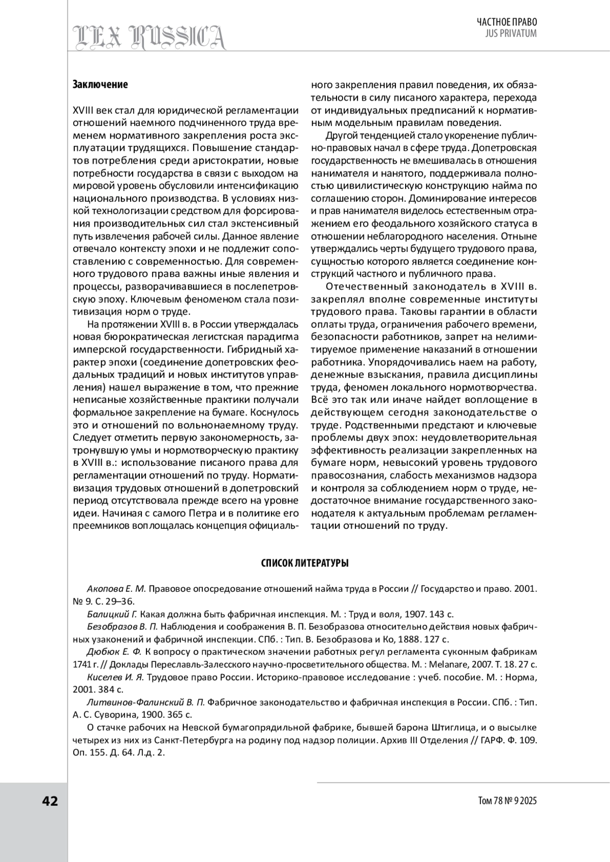 1. Акопова Е. М. Правовое опосредование отношений найма труда в России // Государство и право. 2001. № 9. С. 29-36.