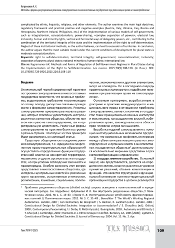 Представленная работа в определенной степени продолжает опубликованную ранее в журнале Lex russica статью, посвященную вопросам реализации права на самоопределение на примере Российской Федерации и иных федеративных государств (Каграманов А. К. Этнорегиональная самостоятельность и автономия как способы осуществления права на самоопределение // Lex russica. 2022. Т. 75. № 2. С. 9–23). Автором предпринята попытка раскрыть особенности осуществления права на самоопределение и урегулирования конфликтов в многосоставных унитарных государствах и разделенных обществах, осложненных этническим, языковым, религиозным и другими элементами. Рассмотрены основные правовые доктрины, нормативная база и практические позитивные и негативные примеры (Австрия, Италия, Украина, Ирак, Босния и Герцеговина, Северная Ирландия, Филиппины и др.) воплощения различных моделей самоуправления, таких как интеграционизм, консоционализм, объединение власти, сложное разделение власти, избирательное право, инклюзивность, права человека и национальных меньшинств, вертикальные и горизонтальные способы делегирования полномочий и т. д., способствующих сочетанию территориальной целостности государства и реализации права на самоопределение. Пренебрежение указанными институциональными методами может привести к сецессии территорий. В заключение делается вывод о том, что наиболее подходящей моделью в условиях современного развития многосоставных государств является умеренный консоционализм.