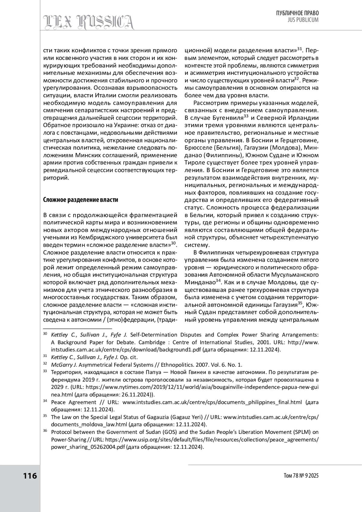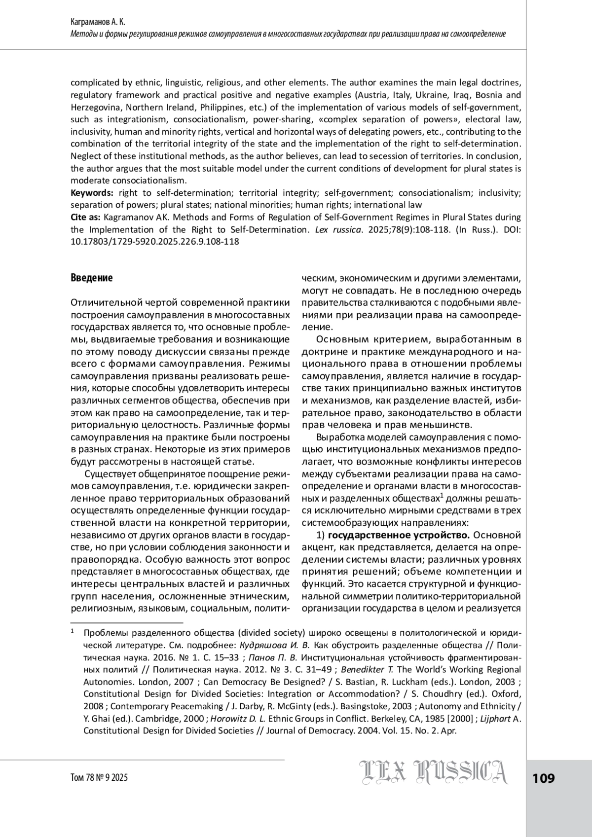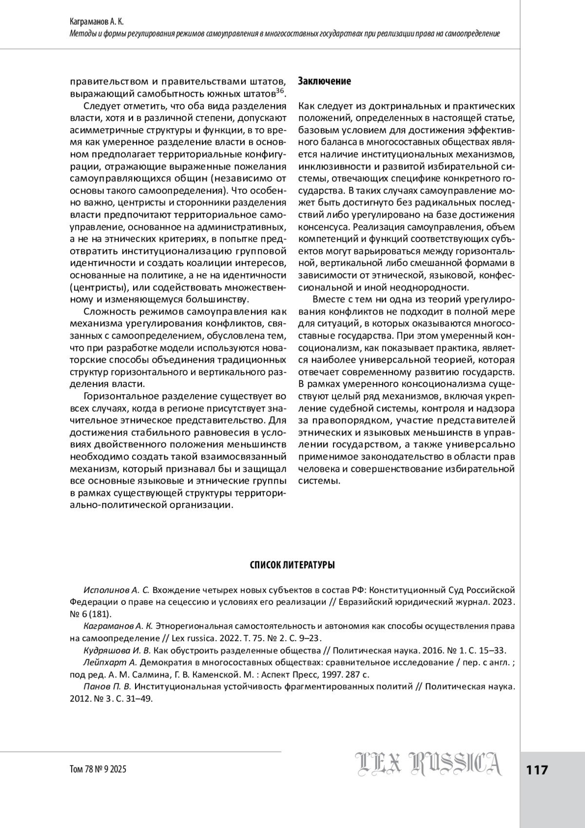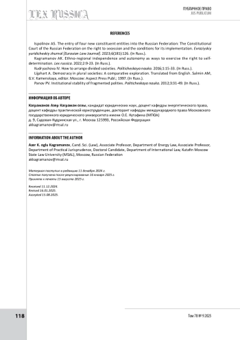 2. Каграманов А. К. Этнорегиональная самостоятельность и автономия как способы осуществления права на самоопределение // Lex russica. 2022. Т. 75. № 2. С. 9-23.