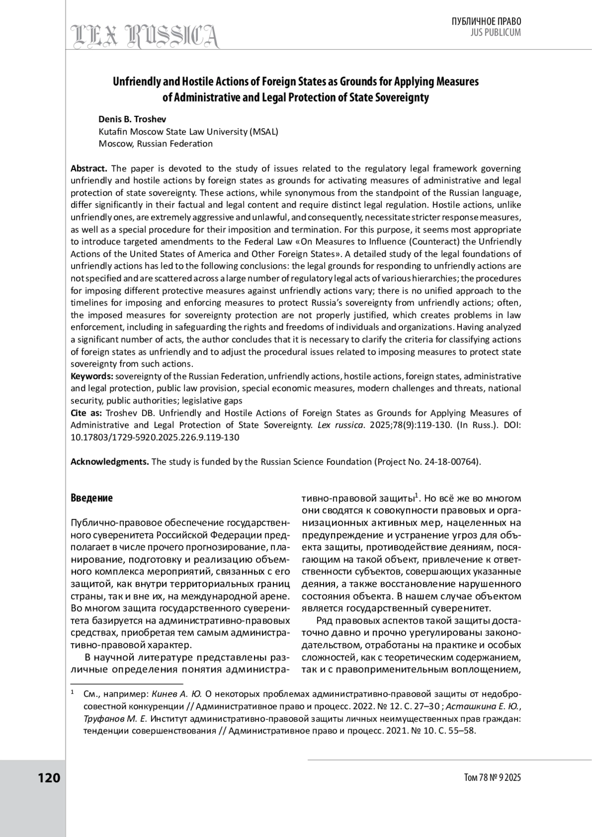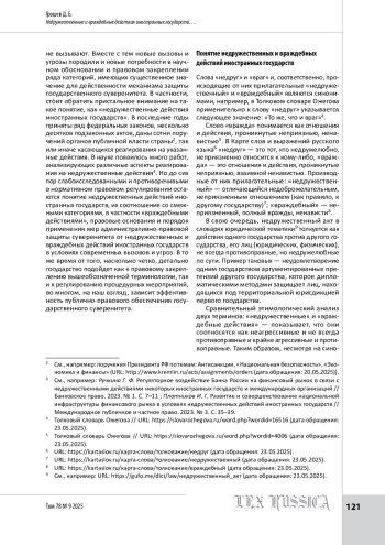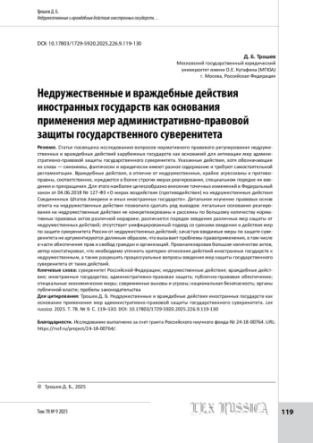Статья посвящена исследованию вопросов нормативного правового регулирования недружественных и враждебных действий зарубежных государств как оснований для активации мер административно-правовой защиты государственного суверенитета. Указанные действия, хотя обозначающие их слова — синонимы, фактически и юридически имеют разное содержание и требуют самостоятельной регламентации. Враждебные действия, в отличие от недружественных, крайне агрессивны и противоправны, соответственно, нуждаются в более строгих мерах реагирования, специальном порядке их введения и прекращения. Для этого наиболее целесообразно внесение точечных изменений в Федеральный закон от 04. 06. 2018 № 127-ФЗ «О мерах воздействия (противодействия) на недружественные действия Соединенных Штатов Америки и иных иностранных государств». Детальное изучение правовых основ ответа на недружественные действия позволило сделать ряд выводов: легальные основания реагирования на недружественные действия не конкретизированы и рассеяны по большому количеству нормативных правовых актов различной иерархии; различается порядок введения различных мер защиты от недружественных действий; отсутствует унифицированный подход со сроками введения и действия мер по защите суверенитета России от недружественных действий; зачастую вводимые меры по защите суверенитета не аргументируются должным образом, что вызывает проблемы правоприменения, в том числе в части обеспечения прав и свобод граждан и организаций. Проанализировав большое количество актов, автор констатировал, что необходимо уточнить критерии отнесения действий иностранных государств к недружественным, а также разрешить процессуальные вопросы введения мер защиты государственного суверенитета от таких действий.