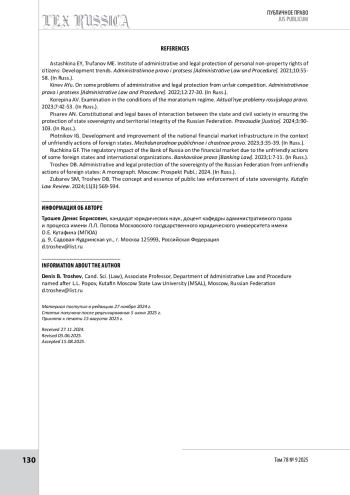 7. Трошев Д. Б. Административно-правовая защита суверенитета Российской Федерации от недружественных действий иностранных государств : монография. М. : Проспект, 2024. 128 с.