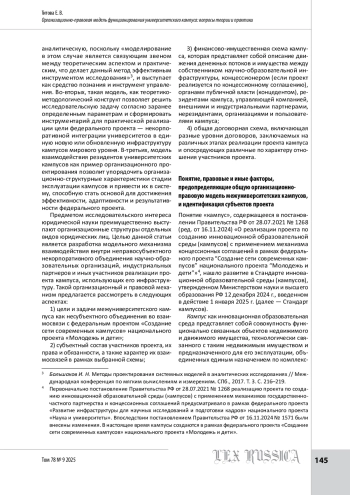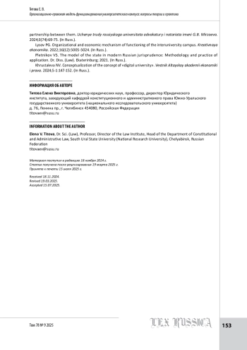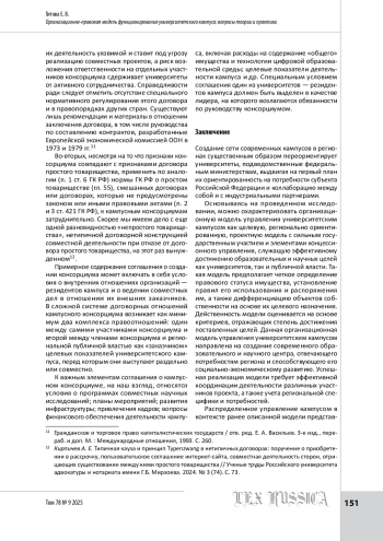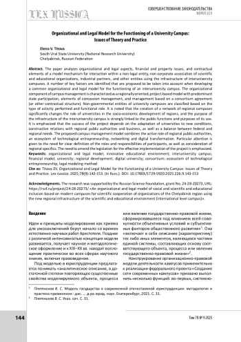 В статье анализируются организационно-правовые аспекты, финансово-имущественные схема и договорные элементы модельного механизма взаимодействия внутри неправосубъектного некорпоративного объединения научно-образовательных организаций, индустриальных партнеров и иных субъектов, использующих инфраструктуру межуниверситетских кампусов. Выделен ряд ключевых факторов, которые предлагается учитывать при разработке общей организационно-правовой модели функционирования межуниверситетского кампуса. Дана характеристика организационной составляющей управления кампусом как регионально ориентированной, проектной модели с преобладающим государственным участием, элементами концессионного управления и управления, основанного на соглашении о консорциуме (или иной договорной конструкции). Проведена классификация невластных субъектов университетских кампусов по критерию осуществляемой деятельности и функциональной роли. Отмечается, что создание сети региональных кампусов существенно меняет роль университетов в социально-экономическом развитии регионов, а целевое назначение инфраструктуры межуниверситетского кампуса прочно связано с публичными функциями и целями его использования. Подчеркивается, что успех проекта зависит от адаптации университетов к новым условиям, конструктивных отношений с региональной публичной властью и бизнесом, а также баланса между федеральными и региональными потребностями. Предлагаемая модель управления кампусом сочетает активную роль региональной публичной власти, экосистему технологического предпринимательства, сетевое взаимодействие и цифровую трансформацию. Особое внимание уделяется необходимости четкого определения ролей и ответственности участников, а также учету региональной специфики. Акцентируется необходимость внесения изменений в законодательство для эффективной реализации проекта.