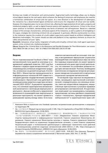 Метавселенная представляет собой эволюционную форму цифрового общества, характеризующуюся развитием социальных атрибутов и интеграцией виртуального и реального миров. Она функционирует как сложная виртуальная социальная система, основанная на реальной социальной структуре и охватывающая различные сферы жизни, такие как политика, экономика и культура. Социальное и транзакционное поведение людей в виртуальной среде постепенно оказывает обратное воздействие на реальную жизнь, формируя новые модели взаимодействия и коммуникации. Технология дополненной реальности позволяет отображать виртуальные объекты на основе реального мира, что усиливает ощущение погружения и подчеркивает необходимость гармоничного сочетания виртуального и реального пространств. Как новое направление развития киберпространства, метавселенная обладает децентрализованной логической архитектурой и обеспечивает интеграцию виртуального и реального миров. Однако последняя порождает новые криминальные риски, влияющие на правовую защиту гражданских прав, прав собственности и интеллектуальной собственности, а также на цифровые финансовые системы и механизмы регулирования. Преступления в виртуальном пространстве продолжают трансформироваться, демонстрируя новые формы поведения и самовыражения. На основе детального анализа концепции, характеристик и социальных аспектов метавселенной, а также моделей противоправного деяния в ней предлагаются стратегии минимизации криминальных рисков. В частности, эффективное противодействие преступлениям в метавселенной требует создания многосубъектной надзорной системы, основанной на технологиях искусственного интеллекта и блокчейна. Эта система должна использовать данные и платформы как ключевые элементы регулирования для обеспечения безопасности и защиты прав пользователей.