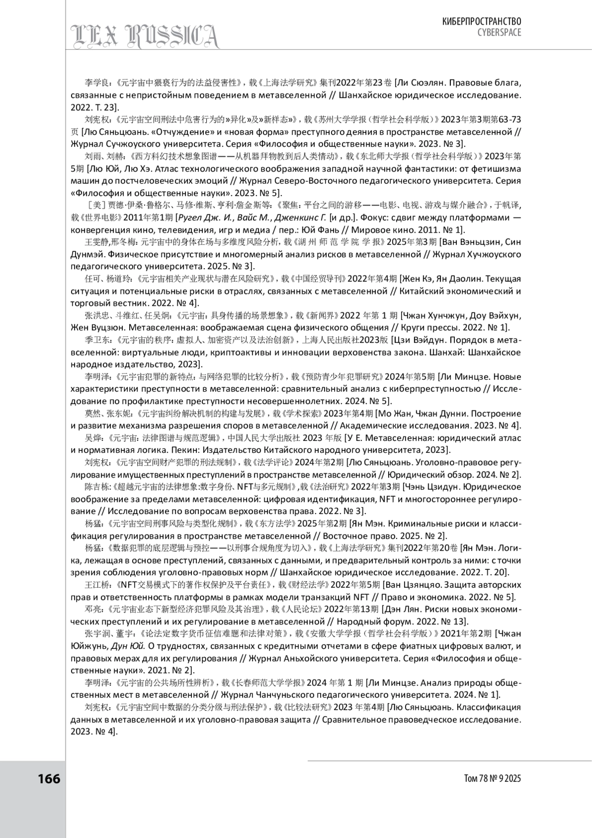 16. 刘宪权:《元宇宙空间财产犯罪的刑法规制》,载《法学评论》2024年第2期 [Лю Сяньцюань. Уголовно-правовое регулирование имущественных преступлений в пространстве метавселенной // Юридический обзор. 2024. № 2].