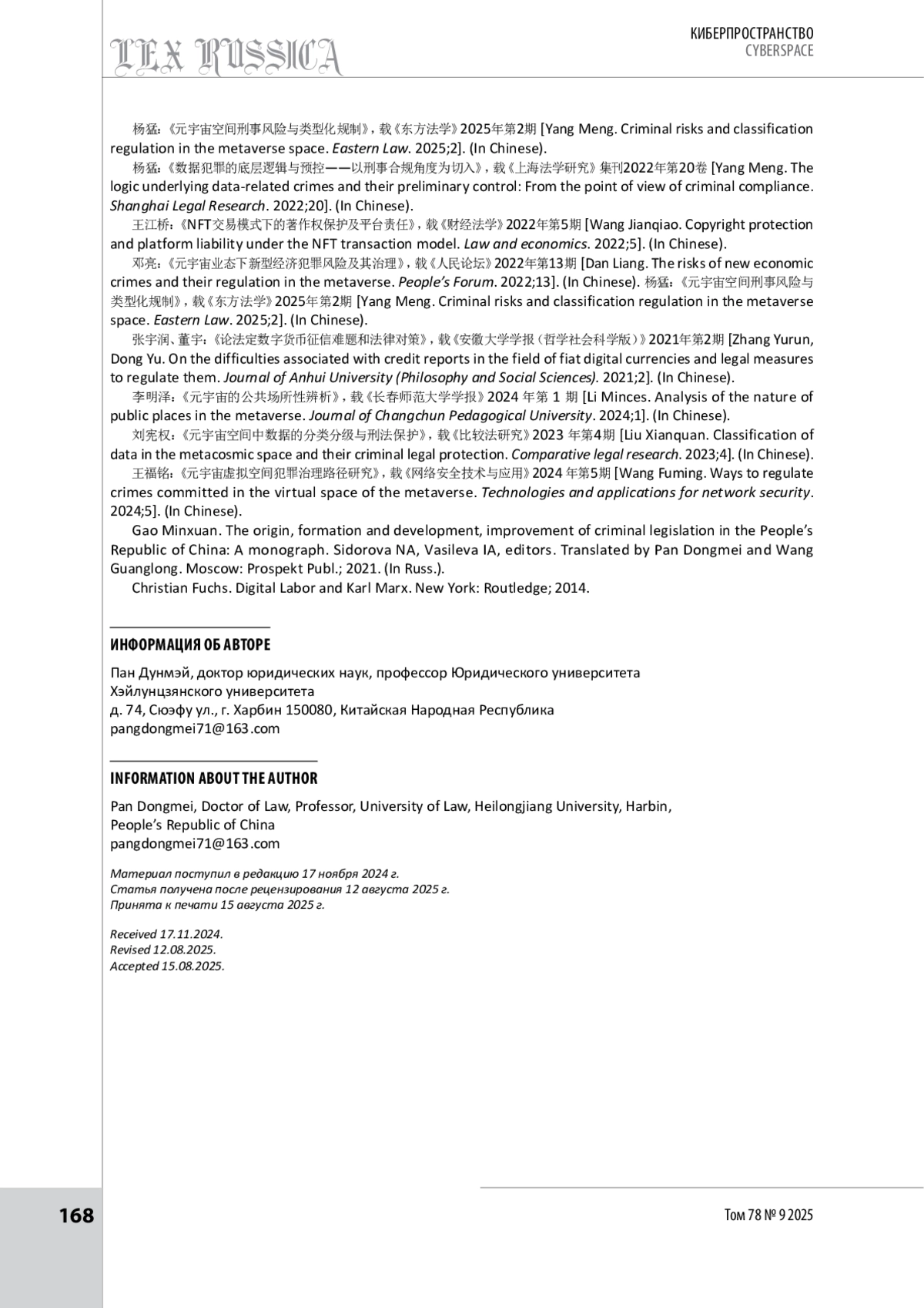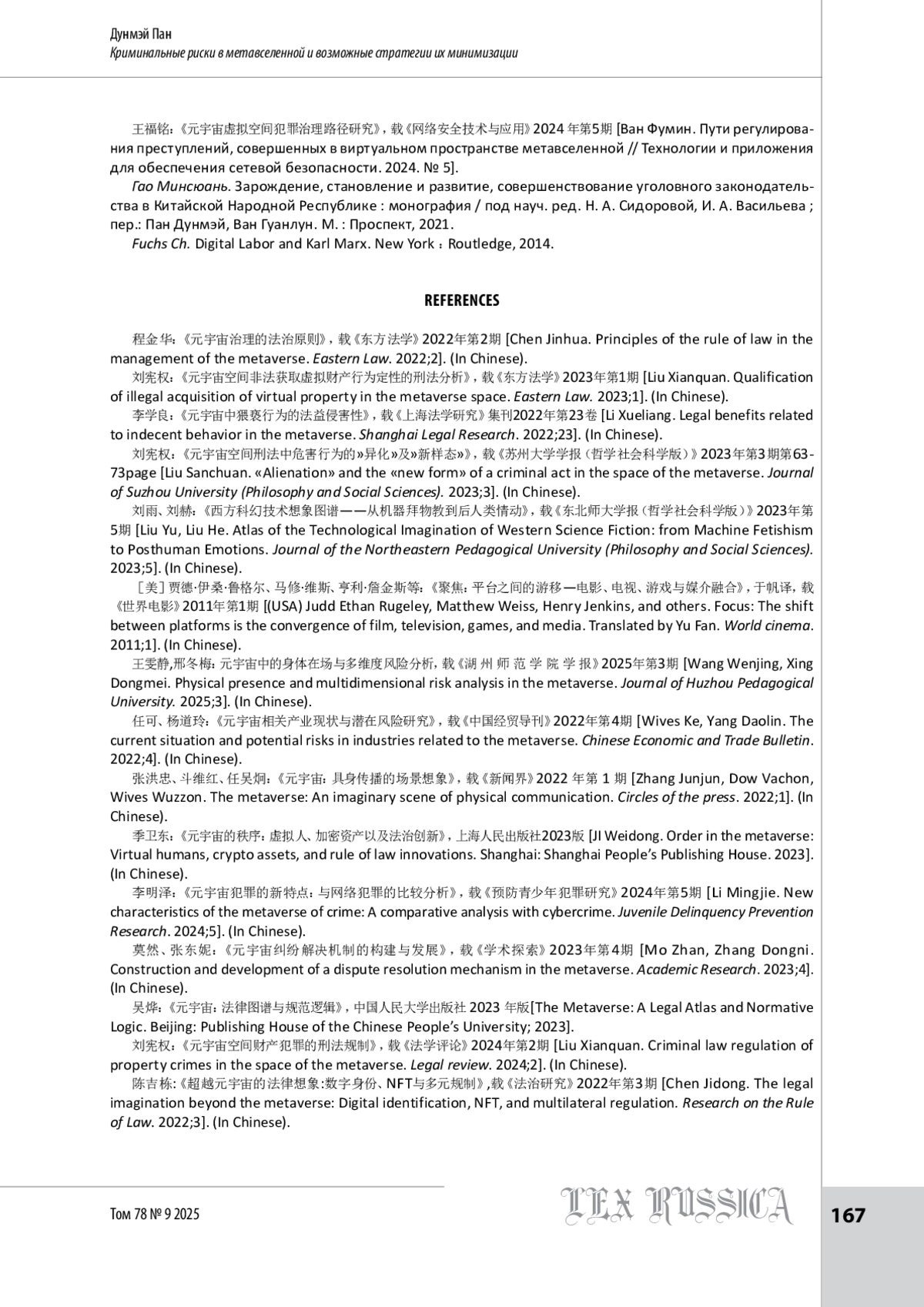18. 杨猛:《元宇宙空间刑事风险与类型化规制》,载《东方法学》2025年第2期 [Ян Мэн. Криминальные риски и классификация регулирования в пространстве метавселенной // Восточное право. 2025. № 2].
