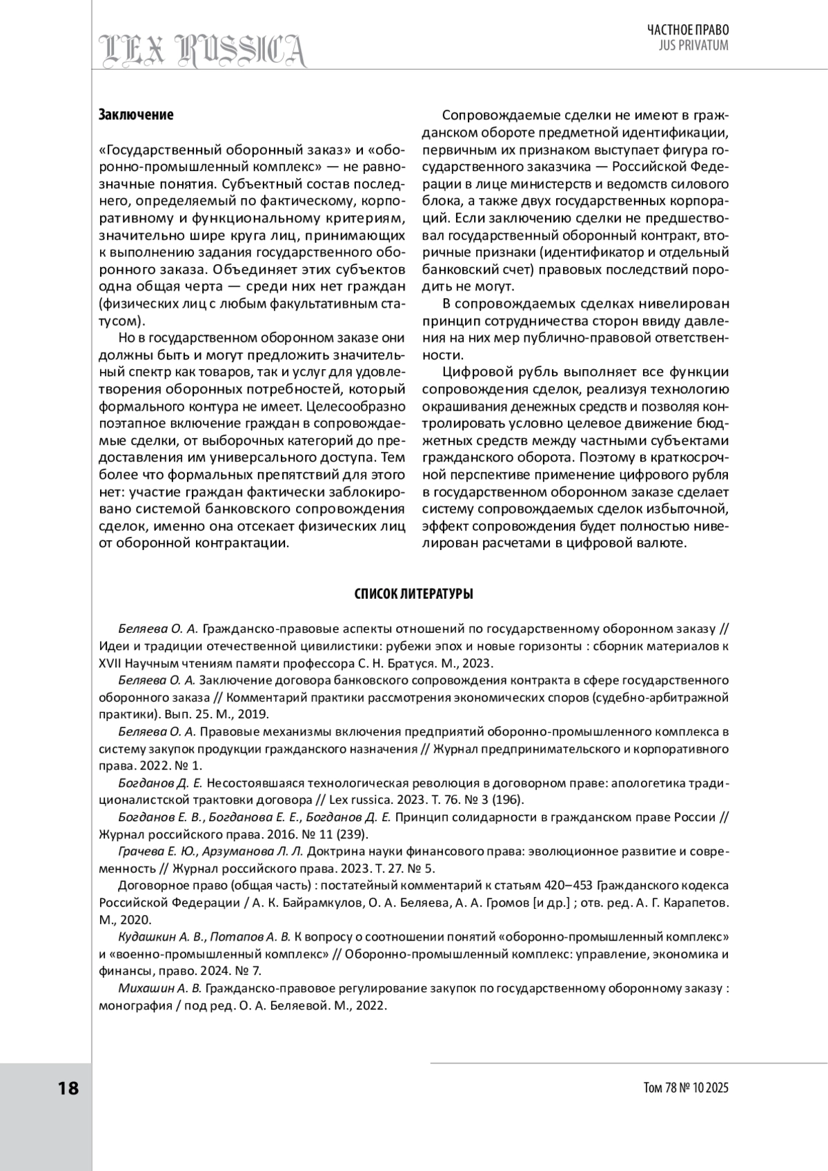 1. Беляева О. А. Гражданско-правовые аспекты отношений по государственному оборонном заказу // Идеи и традиции отечественной цивилистики: рубежи эпох и новые горизонты : сборник материалов к XVII Научным чтениям памяти профессора С. Н. Братуся. М., 2023.