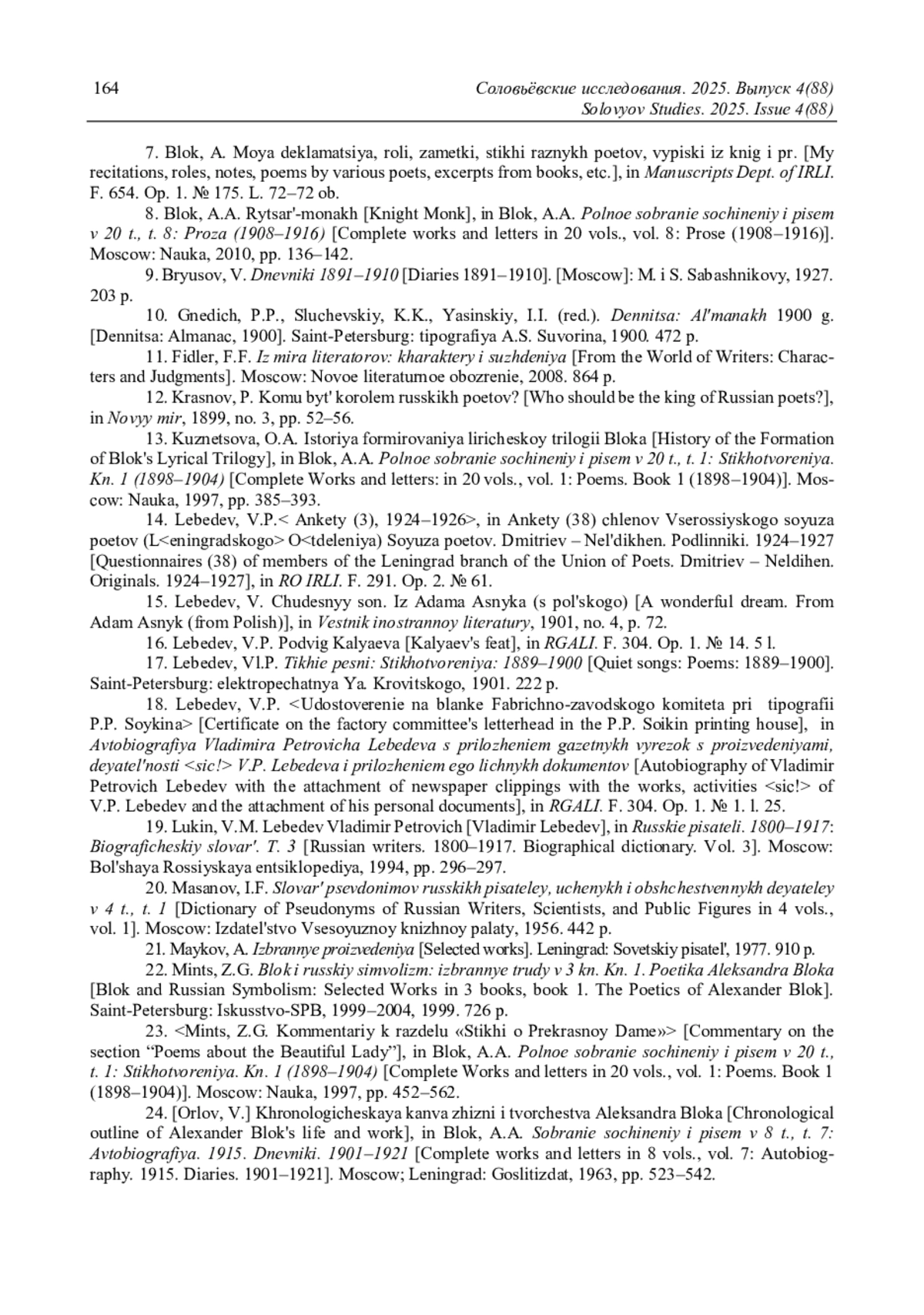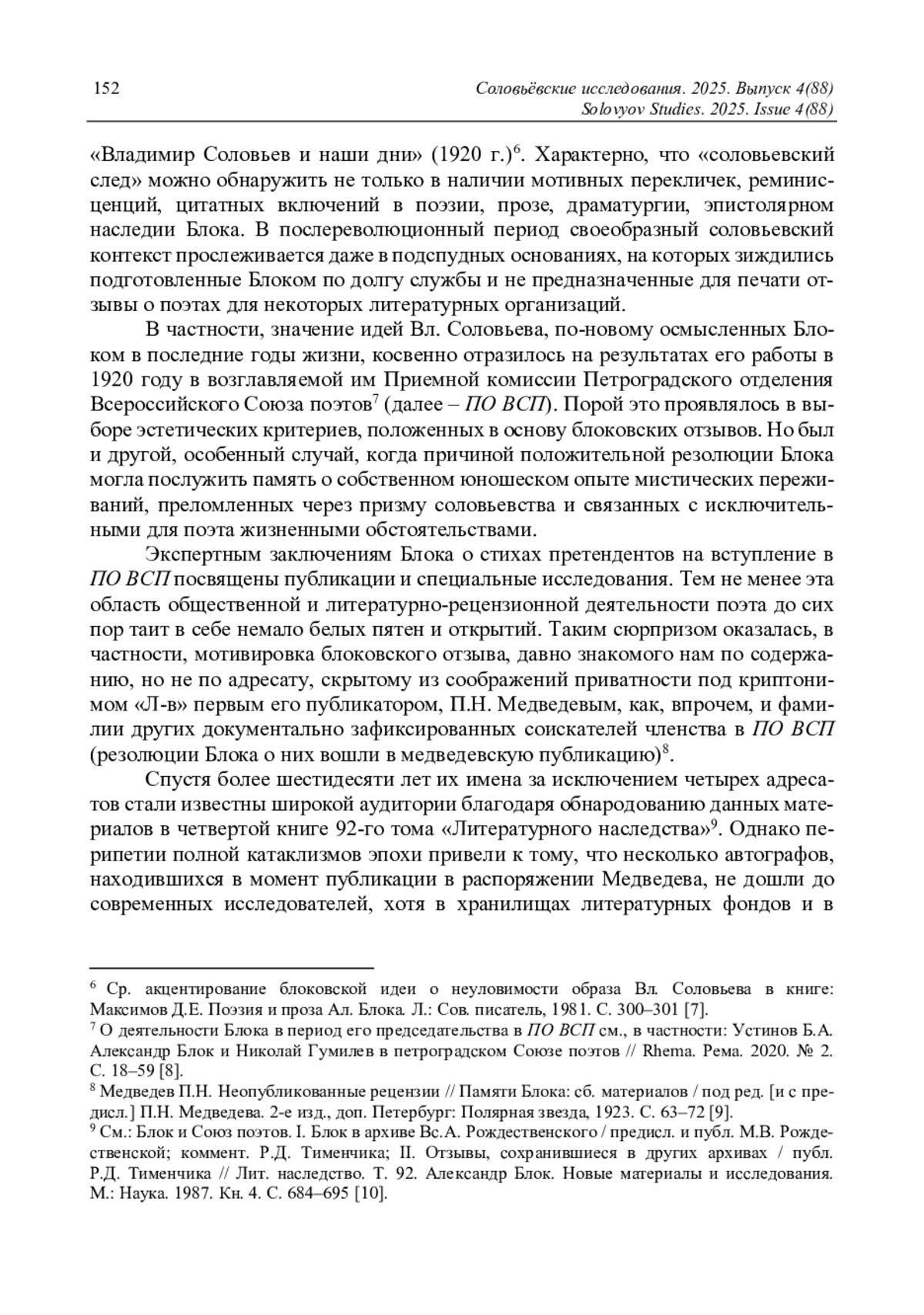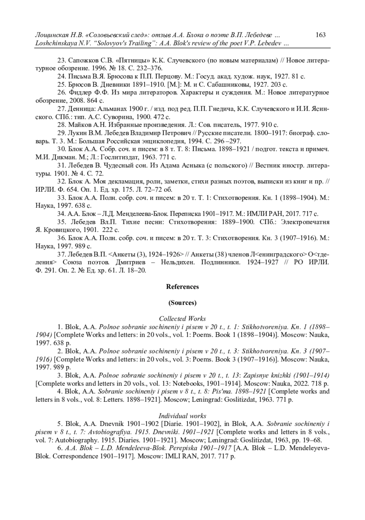 11. Лощинская Н.В. Кто такой “Р-н”: об одном из адресатов отзывов А.А. Блока о поэтах (спустя столетие после их первой публикации П.Н. Медведевым) // Соловьёвские исследования. 2023. Вып. 4(80). С. 161-178.