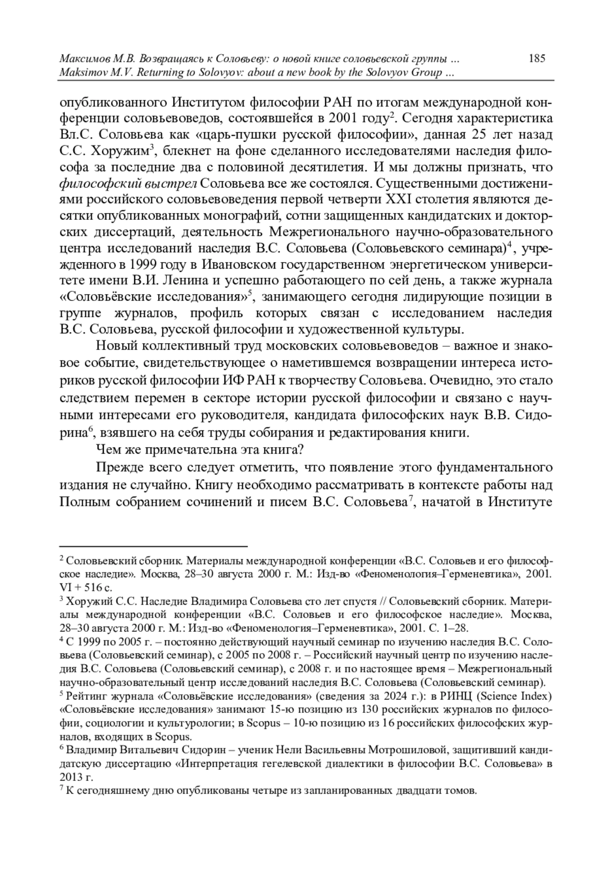 Материалы и исследования: эпоха, люди, идеи» от первого во многом эпохального сборника, опубликованного Институтом философии РАН по итогам международной конференции соловьевоведов, состоявшейся в 2001 году2. Сегодня характеристика Вл. С. Соловьева как «царьпушки русской философии», данная 25 лет назад С. С. Хоружим3, блекнет на фоне сделанного исследователями наследия философа за последние два с половиной десятилетия. И мы должны признать, что философский выстрел Соловьева все же состоялся. Существенными достижениями российского соловьевоведения первой четверти XXI столетия являются десятки опубликованных монографий, сотни защищенных кандидатских и докторских диссертаций, деятельность Межрегионального научно-образовательного центра исследований наследия В. С. Соловьева (Соловьевского семинара)4, учрежденного в 1999 году в Ивановском государственном энергетическом университете имени В. И. Ленина и успешно работающего по сей день, а также журнала «Соловьёвские исследования»5, занимающего сегодня лидирующие позиции в группе журналов, профиль которых связан с исследованием наследия В. С. Соловьева, русской философии и художественной культуры.