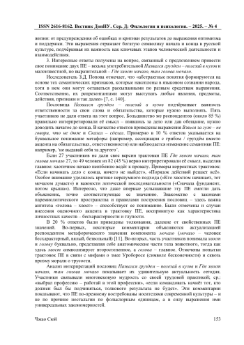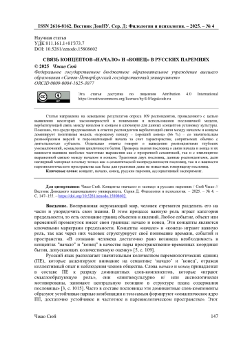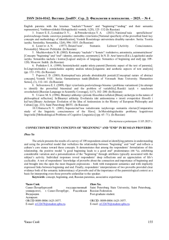 Статья направлена на освещение результатов опроса 109 респондентов, проведенного с целью выявления некоторых закономерностей в понимании и использовании пословичной модели, вербализующей связь между началом и концом и ключевую для данных концептов установку культуры. Показано, что среди предложенных в ответах респондентов вербализаций связи между началом и концом доминирует позитивная модель «хорошему началу - хороший конец» (66 %) - со значительным разнообразием версий и персонализацией начала за счет характеристик, сопрягаемых обычно с деятельностью субъекта. Отдельные ответы говорят о выведении респондентами глубоких умозаключений, осмыслении цикличности бытия. Проверка знания пословиц о связи начала и конца и их важности выявила наиболее частотные выражения как с прозрачной семантикой, так и с имплицитно выраженной связью между началом и концом. Трактовки двух пословиц, данные респондентами, дали наглядный материал в пользу тезиса как о семантической неопределенности пословиц, так и о важности паремиологического пространства как базы для трактовки даже не известных говорящему пословиц.
