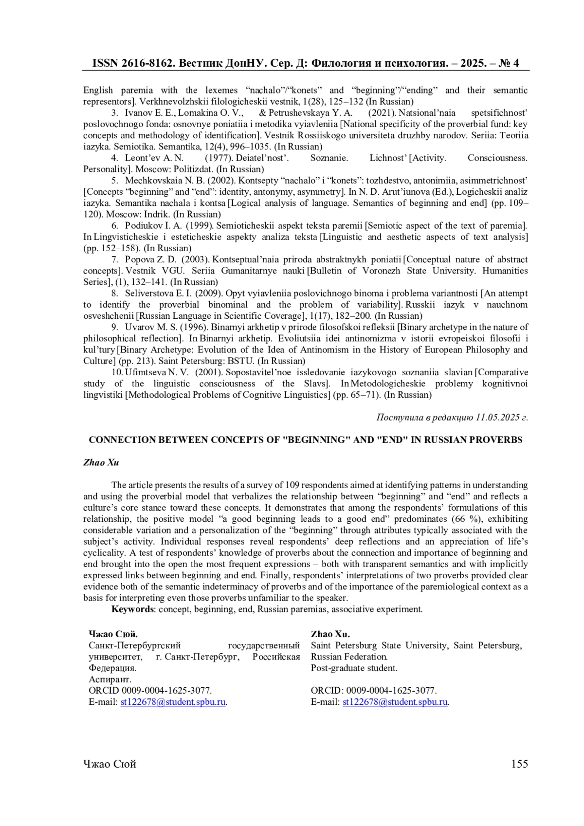 2. Ермакова Л.А. Отражение референциальных ситуаций в оценочной семантике русских и английских паремий с лексемами “начало” / “конец” и “beginning” / “ending” и их смысловыми репрезентаторами / Л.А. Ермакова, С.Ю. Лаврова // Верхневолжский филологический вестник. - 2022. - №1 (28). - С. 125-132. EDN: HEOYMR