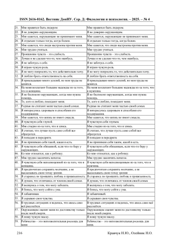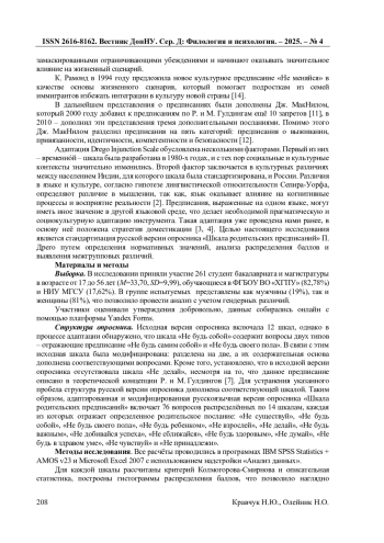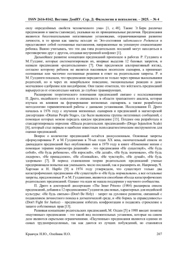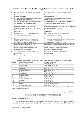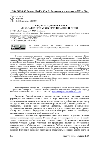 3. Кравчук Н.Ю. Методологические основы прагматической и социокультурной адаптации психологических опросников (на примере опросника “Шкала родительских предписаний” П. Дрего) / Н.Ю. Кравчук // Социальные и психологические ресурсы развития личности: материалы Междунар. науч.-практ. конф. (27-28 марта 2025 г.) / ред. Е.Е. Блинова. - Симферополь: ИТ “АРИАЛ”, 2025. - С. 535-542. EDN: DPJGWM