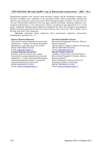 В статье представлены результаты стандартизации русскоязычной версии опросника «Шкала родительских предписаний» П. Дрего, состоящего из 76 утверждений, организованных в 14 шкал. Выборка составила 261 студента в возрасте 17-56 лет. Для оценки распределений рассчитаны описательная статистика, критерий Колмогорова-Смирнова. Нормативные границы выборки установлены с помощью процентильного метода, что позволило адекватно учитывать асимметрию распределений и различное количество пунктов в шкалах, а также снизить влияние выбросов. По каждой шкале рассчитаны процентили 25 % и 75 %, определяющие нижнюю и верхнюю границы нормы. Для выявления межгрупповых различий применяли критерий χ² Пирсона с последующим пост-хок анализом. Учитывалась возрастная (поколения X, Y, Z) и гендерная специфика. Статистически значимые гендерные различия выявлены в выраженности предписания «Не делай», также обнаружены значимые различия между поколениями X и Z по предписаниям «Не взрослей», «Не думай», «Не будь в здравом уме» и «Не чувствуй».