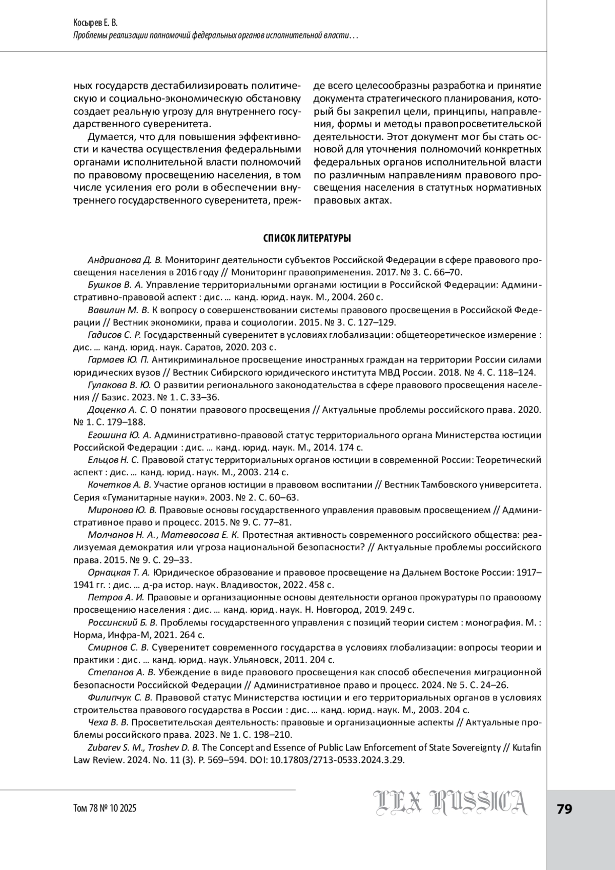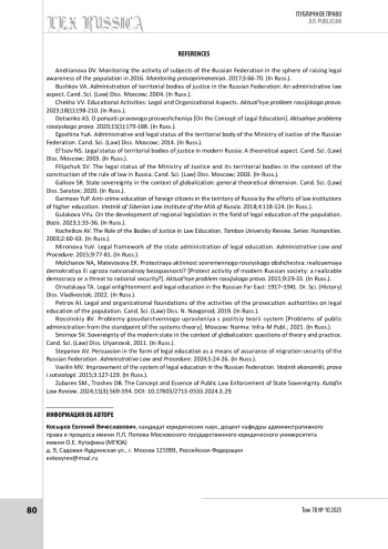 20. Zubarev S. M., Troshev D. B. The Concept and Essence of Public Law Enforcement of State Sovereignty // Kutafin Law Review. 2024. No. 11 (3). P. 569-594. https://doi.org/10.17803/2713-0533.2024.3.29.