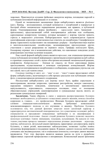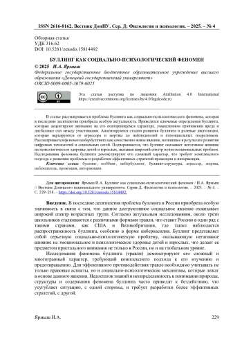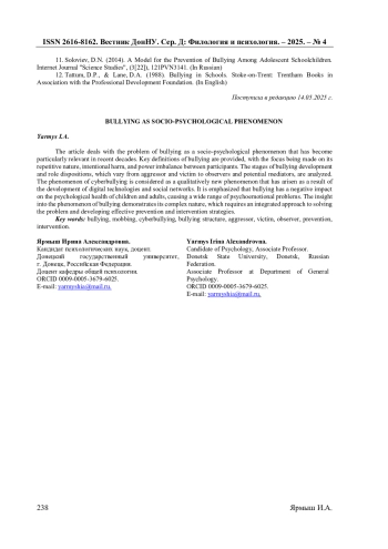 В статье рассматривается проблема буллинга как социально-психологического феномена, которая в последние десятилетия приобрела особую актуальность. Приводятся ключевые определения буллинга, которые акцентируют внимание на его повторяющемся характере, умышленном причинении вреда и дисбалансе сил между участниками. Анализируются стадии развития буллинга и ролевые диспозиции, которые варьируются от агрессора и жертвы до наблюдателей и потенциальных посредников. Рассматривается феномен кибербуллинга как качественно новое явление, возникшее в результате развития цифровых технологий и социальных сетей. Подчеркивается, что буллинг оказывает негативное влияние на психологическое здоровье детей и взрослых, вызывая широкий спектр психоэмоциональных проблем. Исследования феномена буллинга демонстрируют его сложный характер, что требует комплексного подхода к решению проблемы и разработки эффективных стратегий превенции и интервенции.