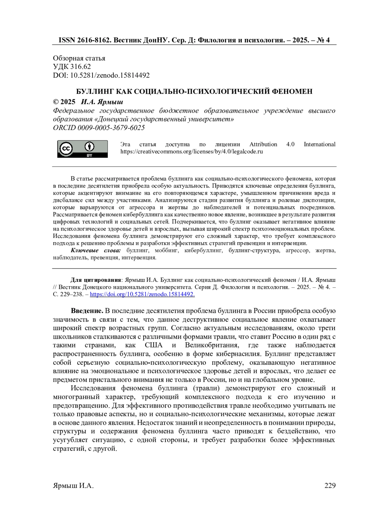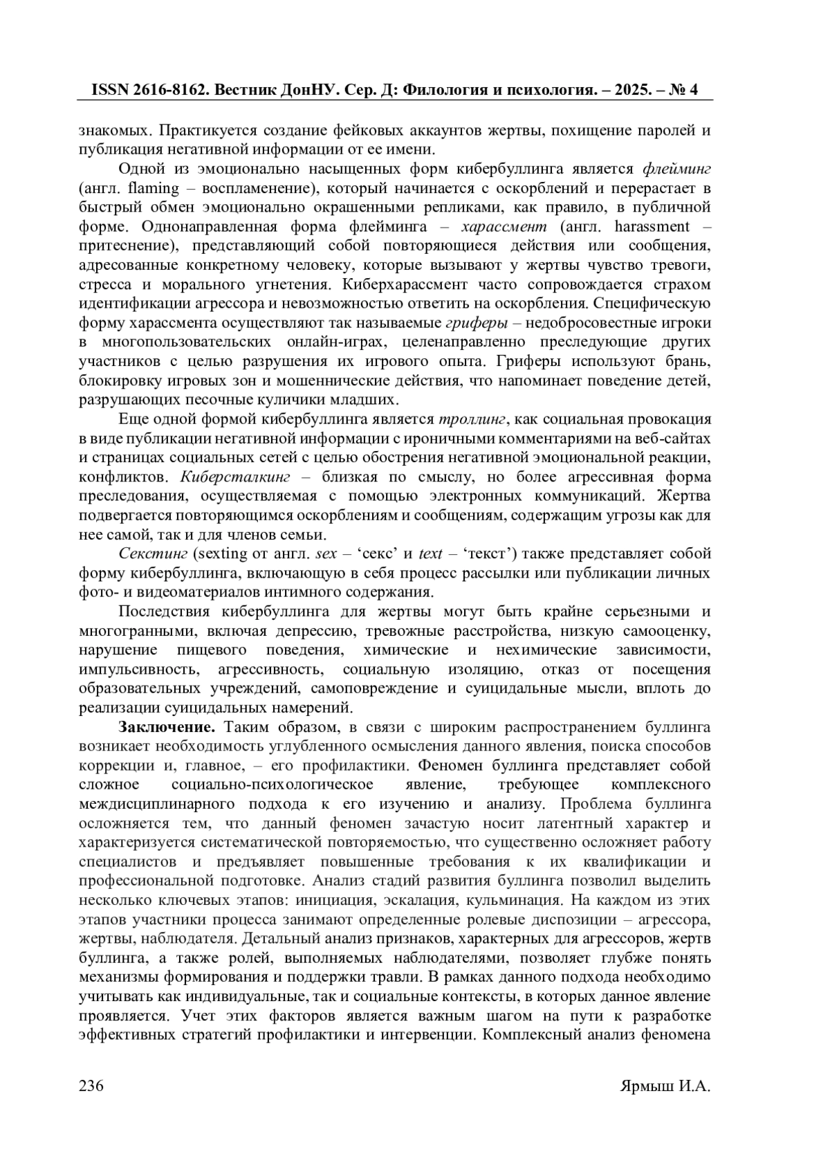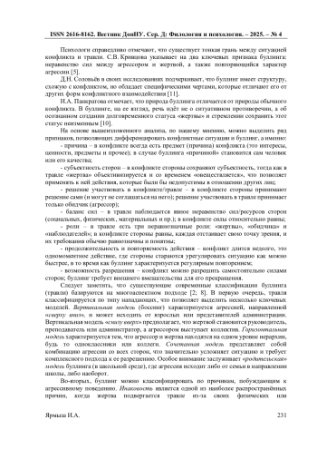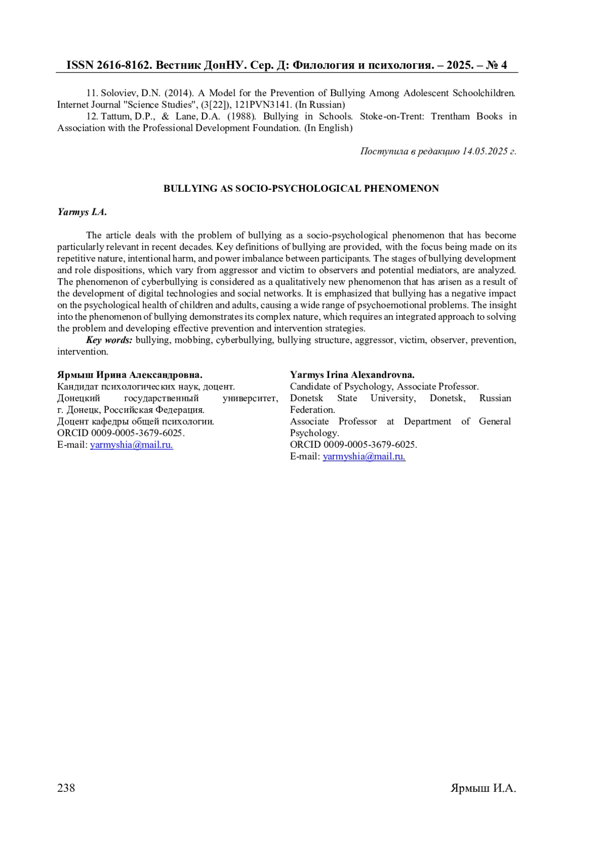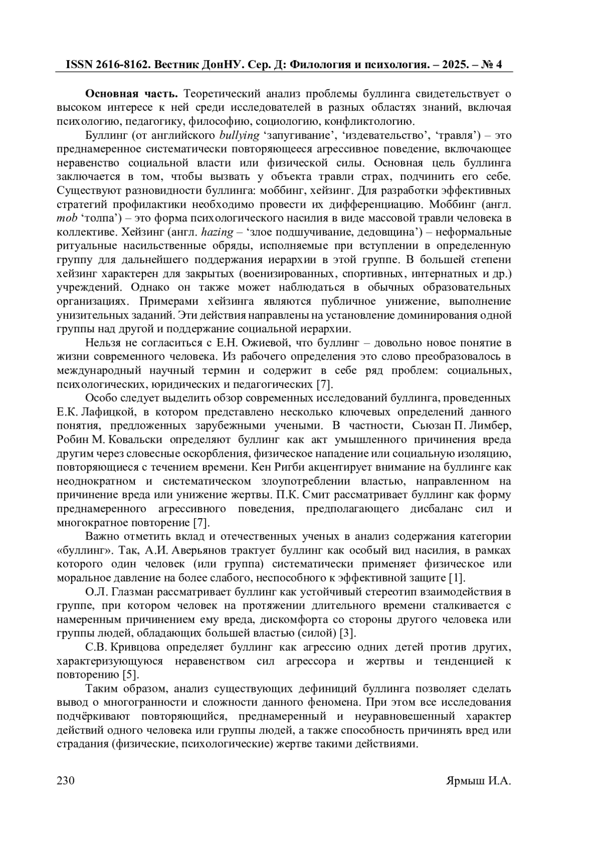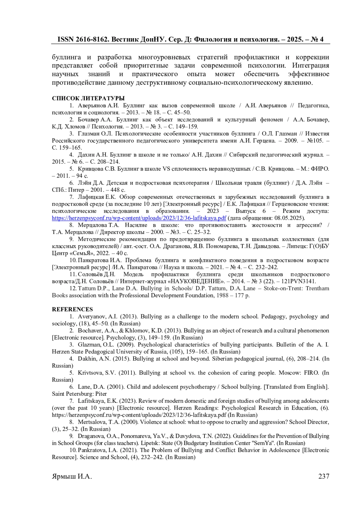 7. Лафицкая Е.К. Обзор современных отечественных и зарубежных исследований буллинга в подростковой среде (за последние 10 лет) [Электронный ресурс] / Е.К. Лафицкая // Герценовские чтения: психологические исследования в образовании. - 2023 - Выпуск 6 - Режим доступа: https://herzenpsyconf.ru/wp-content/uploads/2023/12/36-lafitskaya.pdf (дата обращения: 08.05.2025). EDN: QFUHAJ
