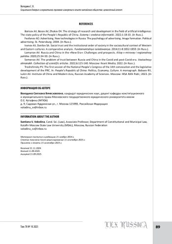 В статье анализируется влияние социокультурного и нормативного измерения на пространство социального доверия в опыте китайского общества. Исследование взаимодействия права и доверия на примере китайского общества показывает интеграцию традиционных и инновационных аспектов; правовая институционализация доверия проводится при обеспечительной функции традиционных ценностей. Само доверие выступает в качестве механизма, который обеспечивает функционирование правовых, политических, экономических отношений. Опыт Китая демонстрирует значимость ресурса социального доверия в формировании и обеспечении развития правовых, политических, экономических институтов. Доверие позволяет общественной системе Китая эффективно осуществлять управление, минимизировать риски внешнего воздействия, повышать оперативность процессов. Анализ примера Китая показывает ключевую роль социокультурного потенциала общества в формировании уникального пространства доверия внутри страны и его влияние на конструирование внешнеполитических отношений. Доверие позволяет достичь и реализовать ключевые принципы международной коммуникации: открытость, прозрачность, объяснимость, сохраняя в то же время баланс внутреннего и внешнего, безопасности и развития. Данные подходы, согласно позиции автора, обладают перспективой применения в России.