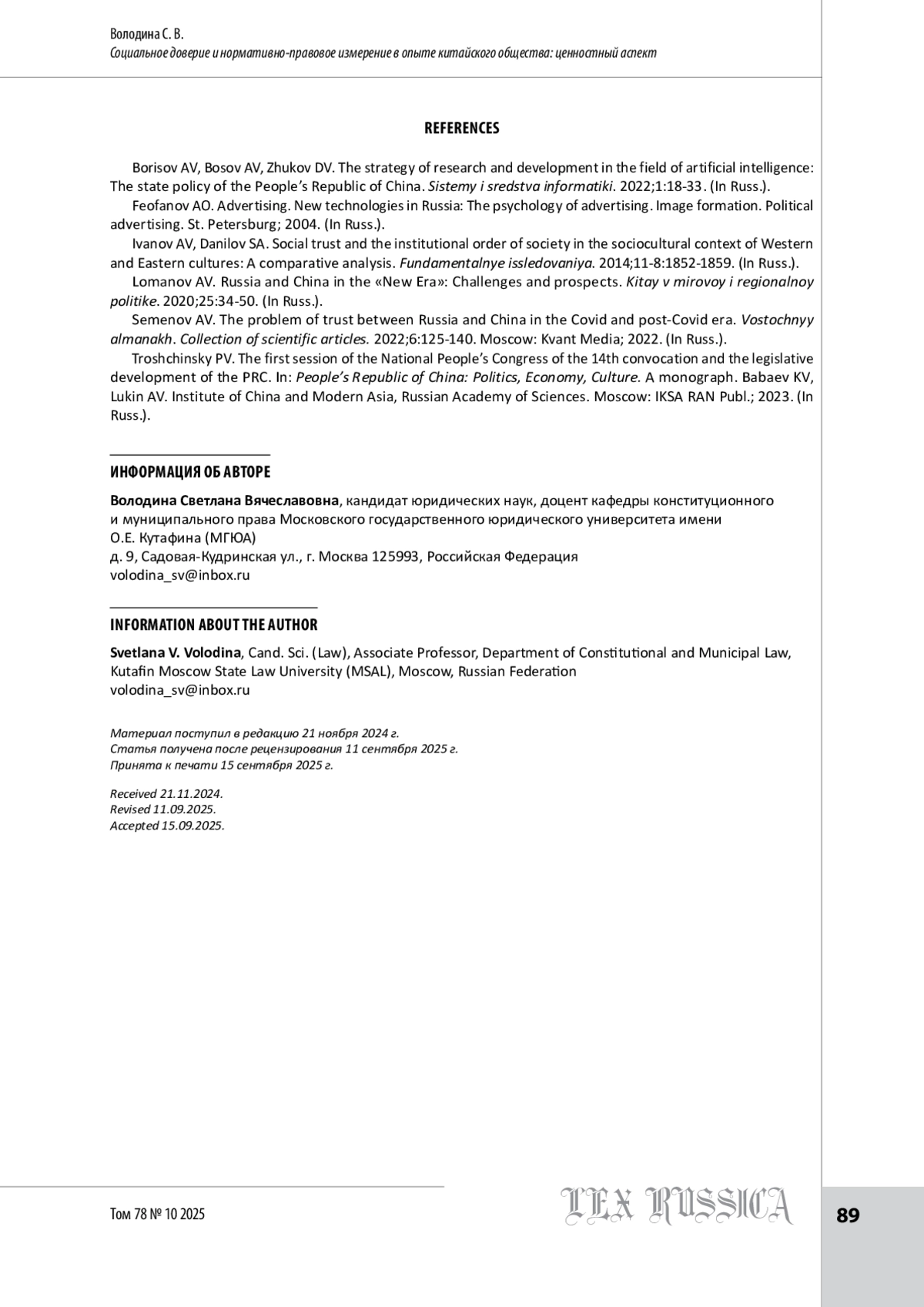 3. Ломанов А. В. Россия и Китай в «новую эпоху»: вызовы и перспективы // Китай в мировой и региональной политике. 2020. № 25. С. 34-50.