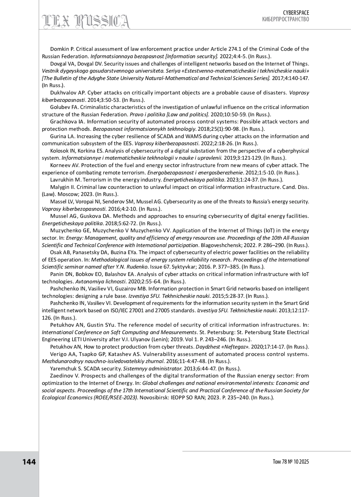 9. Гурина Л. А. Повышение киберустойчивости SCADA и WAMS при кибератаках на информационно-коммуникационную подсистему ЭЭС // Вопросы кибербезопасности. 2022. № 2. С. 18-26.