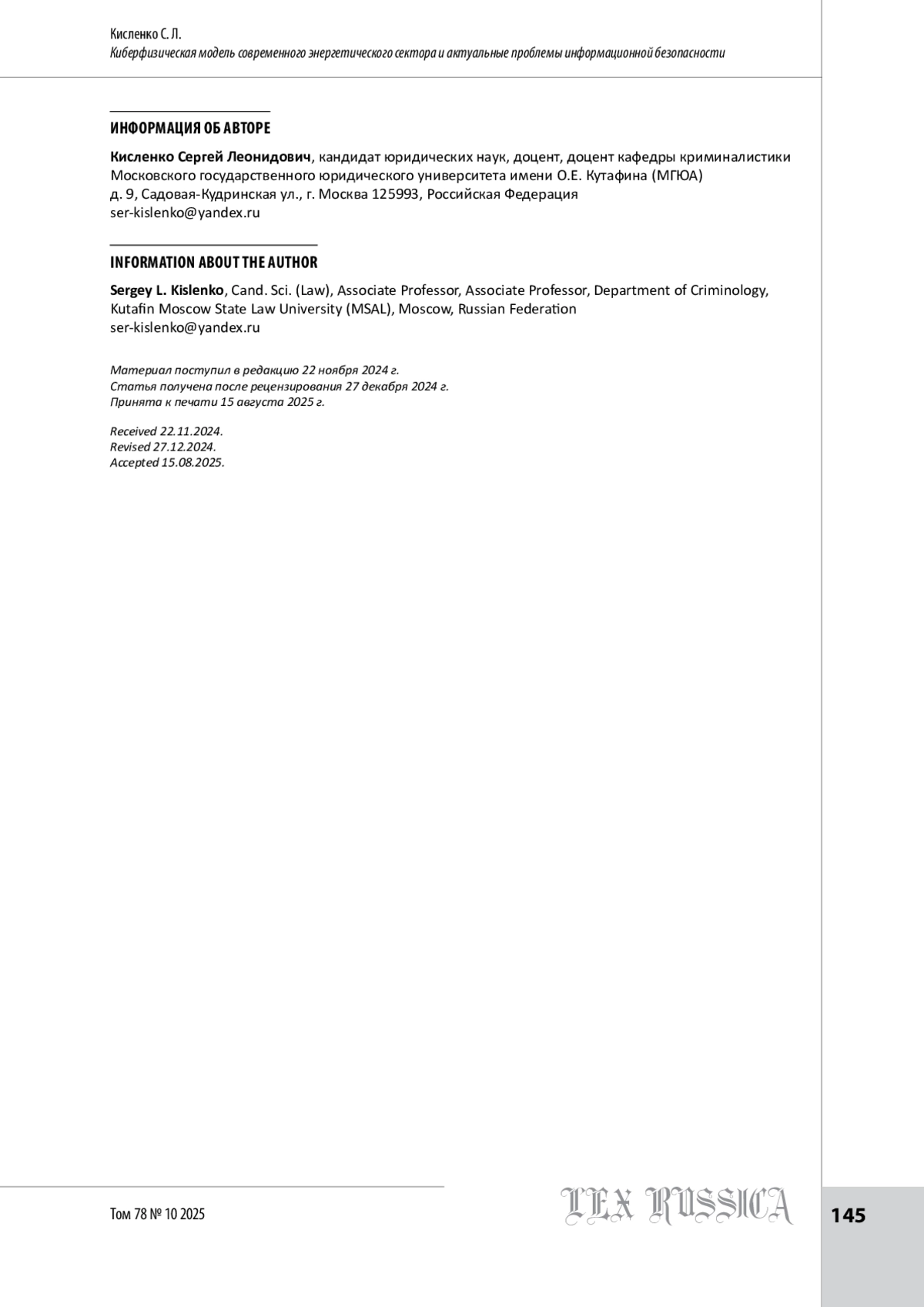 В условиях индустрии 4.0 технологический прогресс является главным вектором развития промышленности. Энергетическая отрасль государства стремительно прогрессирует в первую очередь за счет формирования интеллектуальных энергосетей нового поколения, исходящих из передовых двусторонних коммуникаций между элементами электрических сетей, электрическими станциями, аккумулирующими источниками и потребителями (Smart Grid). Однако новая энергетическая концепция передачи и распределения энергии связана с определенными рисками. Среди последних в связи с повышением уровня компьютеризации и интеллектуализации энергетики особое место занимают угрозы кибербезопасности. Энергетические системы России в условиях вооруженного конфликта и санкционной политики всё чаще подвергаются кибератакам. Применительно к функционированию предприятий энергетической сферы одним из ключевых объектов кибератак выступают критические информационные инфраструктуры. С момента СВО данные атаки осуществляются кибернаемниками (и их группировками), которые привлекаются разными недружественными и запрещенными в России структурами в целях дестабилизации энергетической системы нашего государства. Поскольку от функционирования объектов критической информационной инфраструктуры зависит национальная безопасность страны, актуализируются вопросы своевременного пресечения подобных атак.