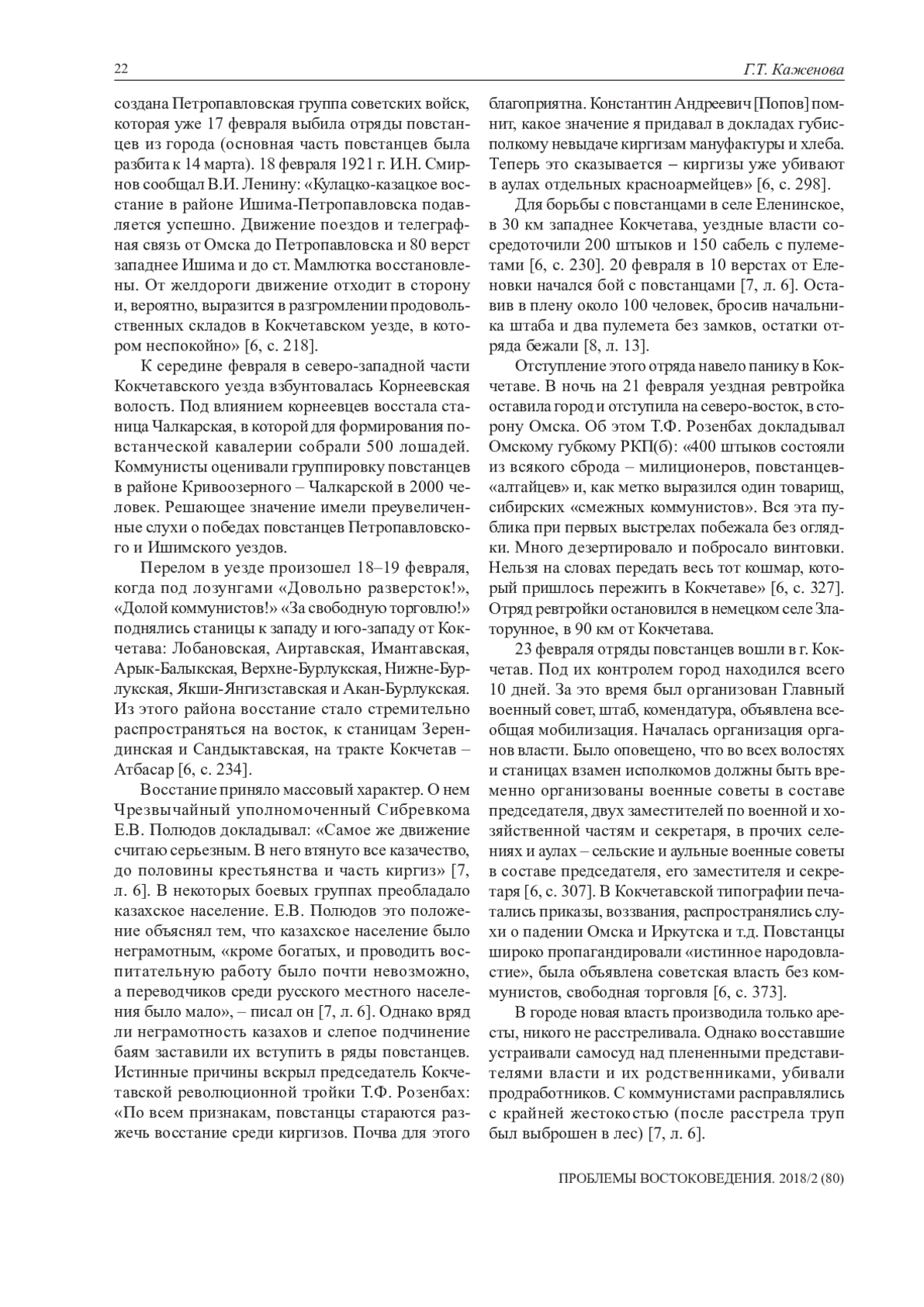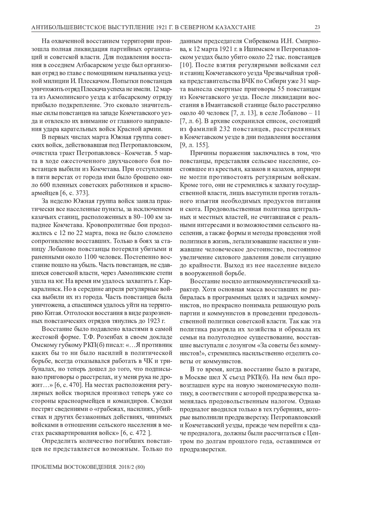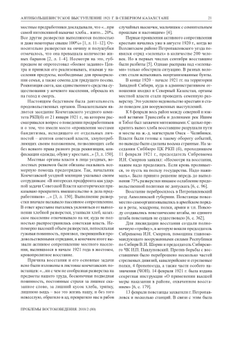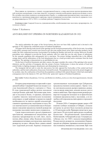 Статья восполняет не до конца исследованные страницы советской истории и посвящена восстанию 1921 г. против коммунистической власти в Северном Казахстане. В работе показано, что причиной восстания стала продовольственная политика советского государства. Крестьяне и казаки были обязаны сдавать излишки хлеба, мяса, масла и других продуктов, однако в реальности у них изымались продукты, необходимые для прокормления семьи, и семена для посева. Казахов-скотоводов вынуждали сдавать живой скот. Изъятие скота, как единственного средства существования у кочевого населения, обрекало их на голод. Протестные настроения усиливались из-за непосильной гужевой повинности и произвола продовольственных отрядов и вызвали активное сопротивление местного населения. Восстание характеризуется как антибольшевистское. На основе архивных документов и других источников рассматривается ход восстания в уездах, показаны действия повстанцев после захвата власти, а также мероприятия местных и центральных органов советской власти по борьбе с повстанческими отрядами и ликвидации восстания
