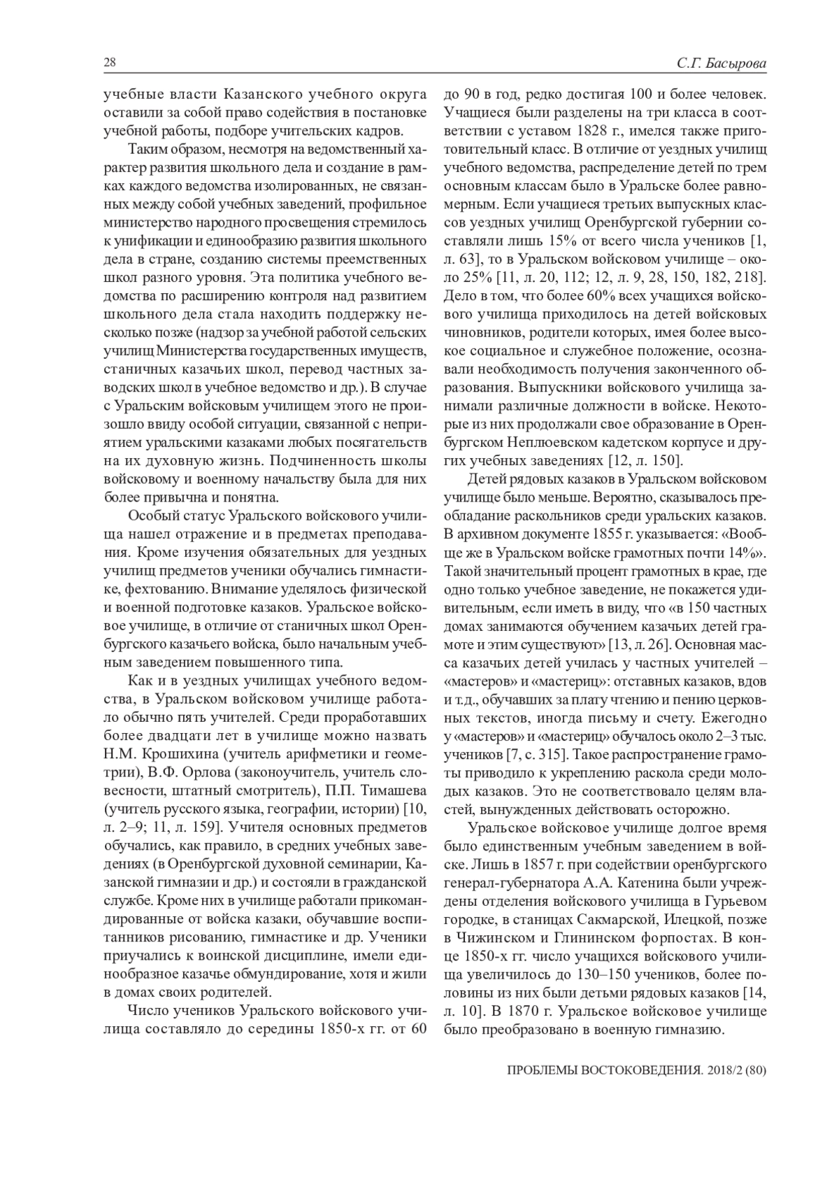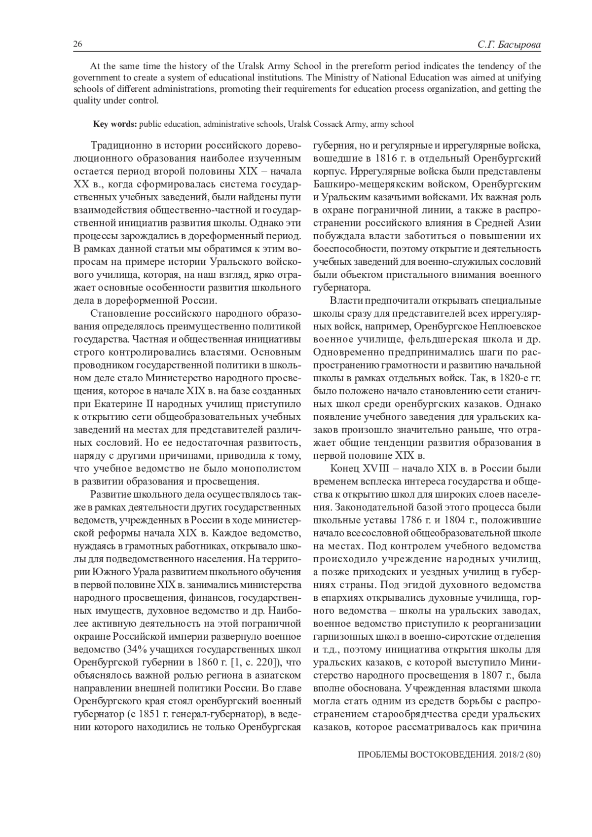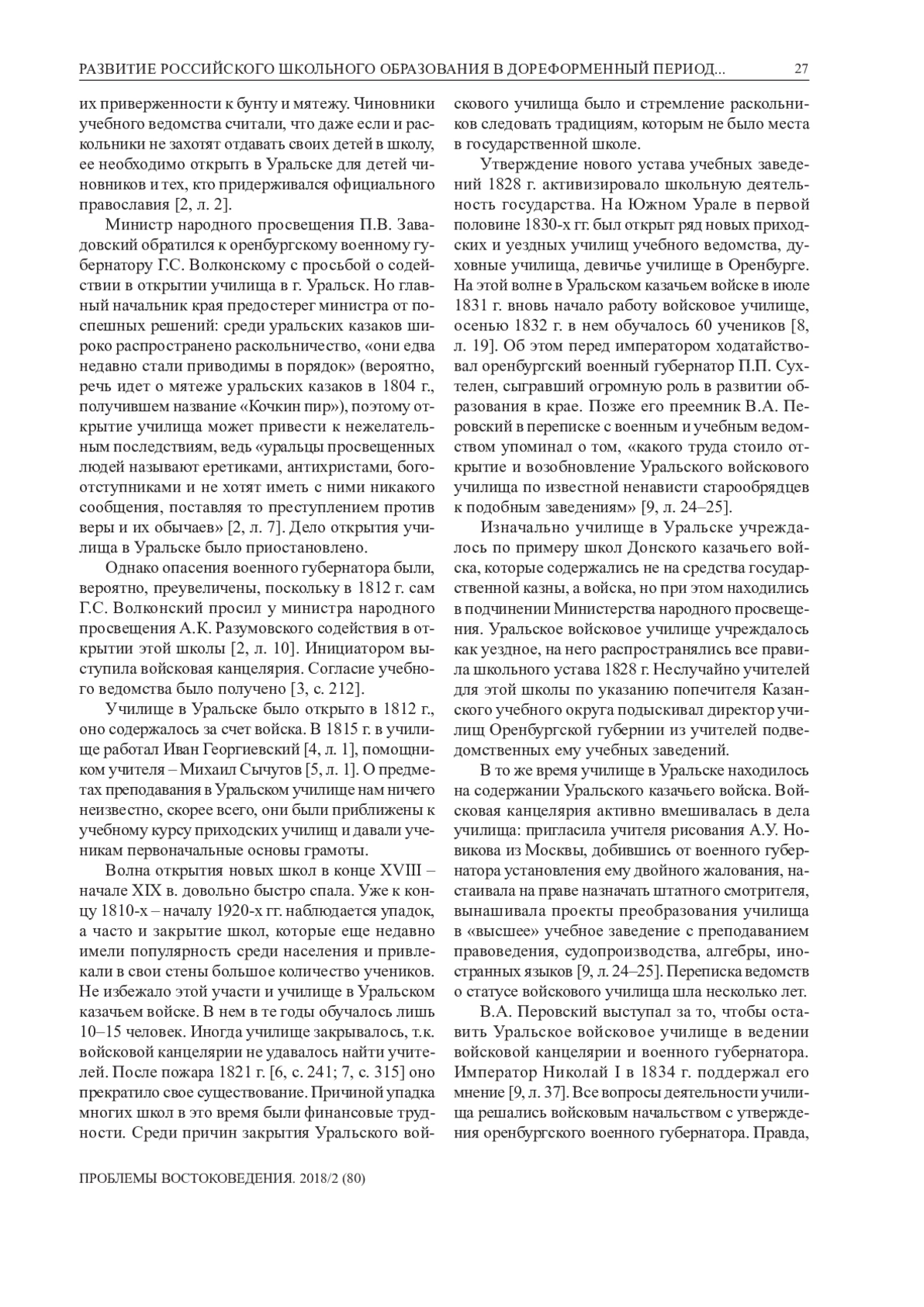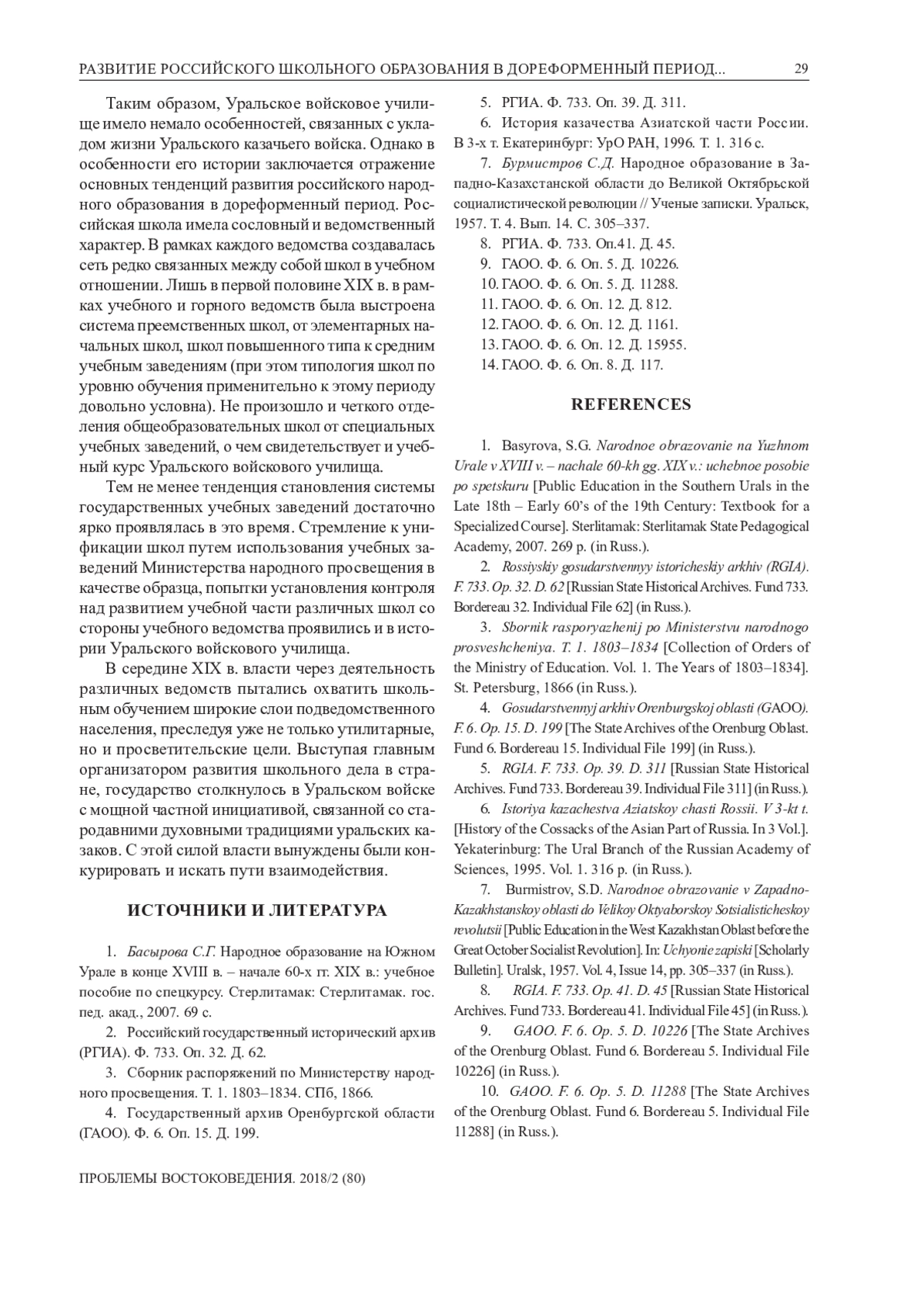 Традиционно в истории российского дореволюционного образования наиболее изученным остается период второй половины XIX – начала XX в., когда сформировалась система государственных учебных заведений, были найдены пути взаимодействия общественно-частной и государственной инициатив развития школы. Однако эти процессы зарождались в дореформенный период. В рамках данной статьи мы обратимся к этим вопросам на примере истории Уральского войскового училища, которая, на наш взгляд, ярко отражает основные особенности развития школьного дела в дореформенной России