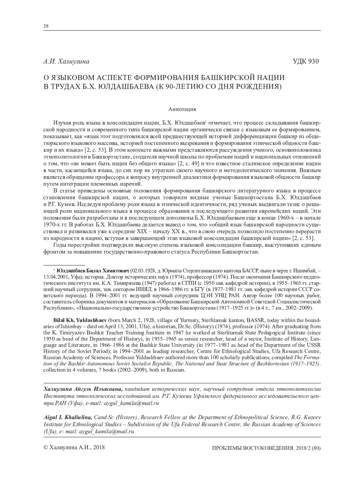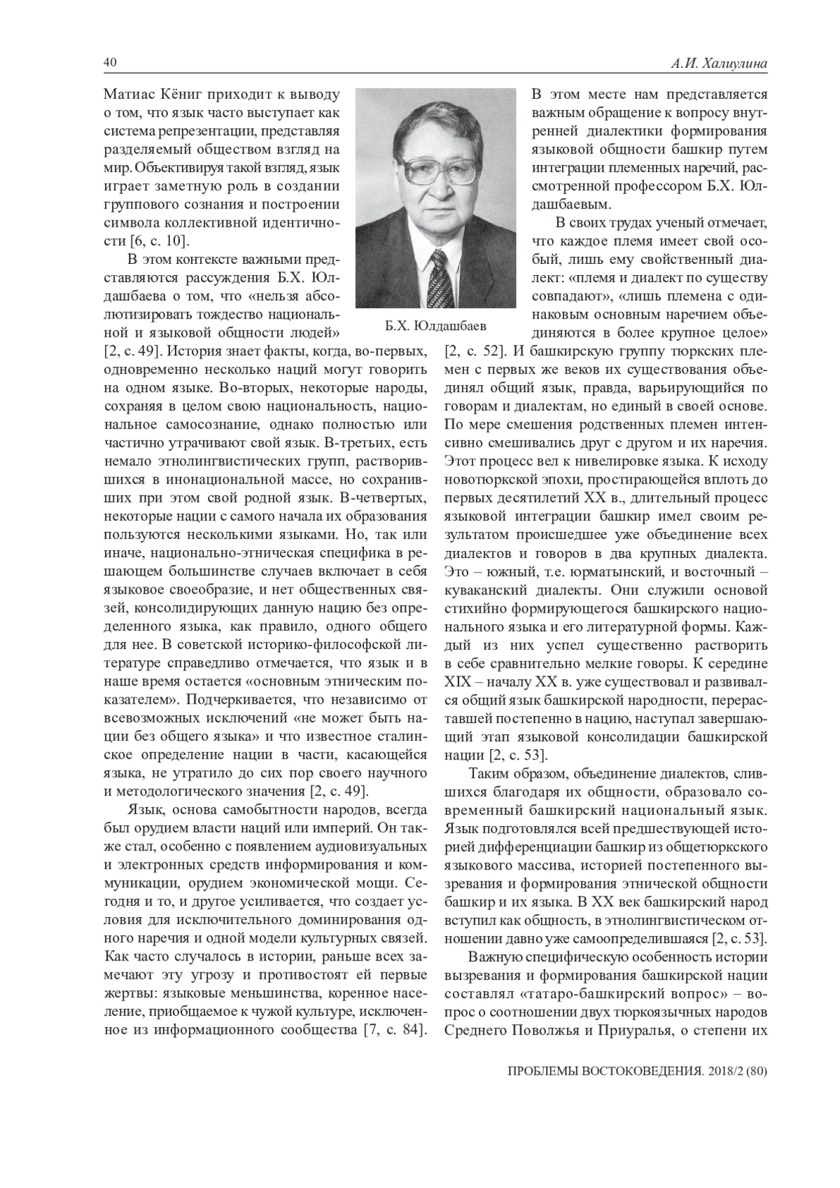Изучая роль языка в консолидации нации, Б. Х. Юлдашбаев1 отмечает, что процесс складывания башкирской народности и современного типа башкирской нации органически связан с языковым ее формированием, показывает, как «язык этот подготовлялся всей предшествующей историей дифференциации башкир из общетюркского языкового массива, историей постепенного вызревания и формирования этнической общности башкир и их языка» [2, с. 53]. В этом контексте важными представляются рассуждения ученого, основоположника этнополитологии в Башкортостане, создателя научной школы по проблемам наций и национальных отношений о том, что «не может быть нации без общего языка» [2, с. 49] и что известное сталинское определение нации в части, касающейся языка, до сих пор не утратило своего научного и методологического значения. Важным является обращение профессора к вопросу внутренней диалектики формирования языковой общности башкир путем интеграции племенных наречий. В статье приведены основные положения формирования башкирского литературного языка в процессе становления башкирской нации, о которых говорили видные ученые Башкортостана Б. Х. Юлдашбаев и Р. Г. Кузеев. Исследуя проблему роли языка в этнической идентичности, ряд ученых выдвигали тезис о решающей роли национального языка в процессе образования и последующего развития европейских наций. Эти положения были разработаны и в последующем дополнены Б. Х. Юлдашбаевым еще в конце 1960-х – в начале 1970-х гг. В работах Б. Х. Юлдашбаева делается вывод о том, что «общий язык башкирской народности существовал и развивался уже к середине XIX – началу XX в., что в свою очередь позволило постепенно перерасти из народности в нацию, вступая в завершающий этап языковой консолидации башкирской нации» [2, с. 53]. Годы перестройки подтвердили высокую степень языковой консолидации башкир, выступивших единым фронтом за повышение государственно-правового статуса Республики Башкортостан