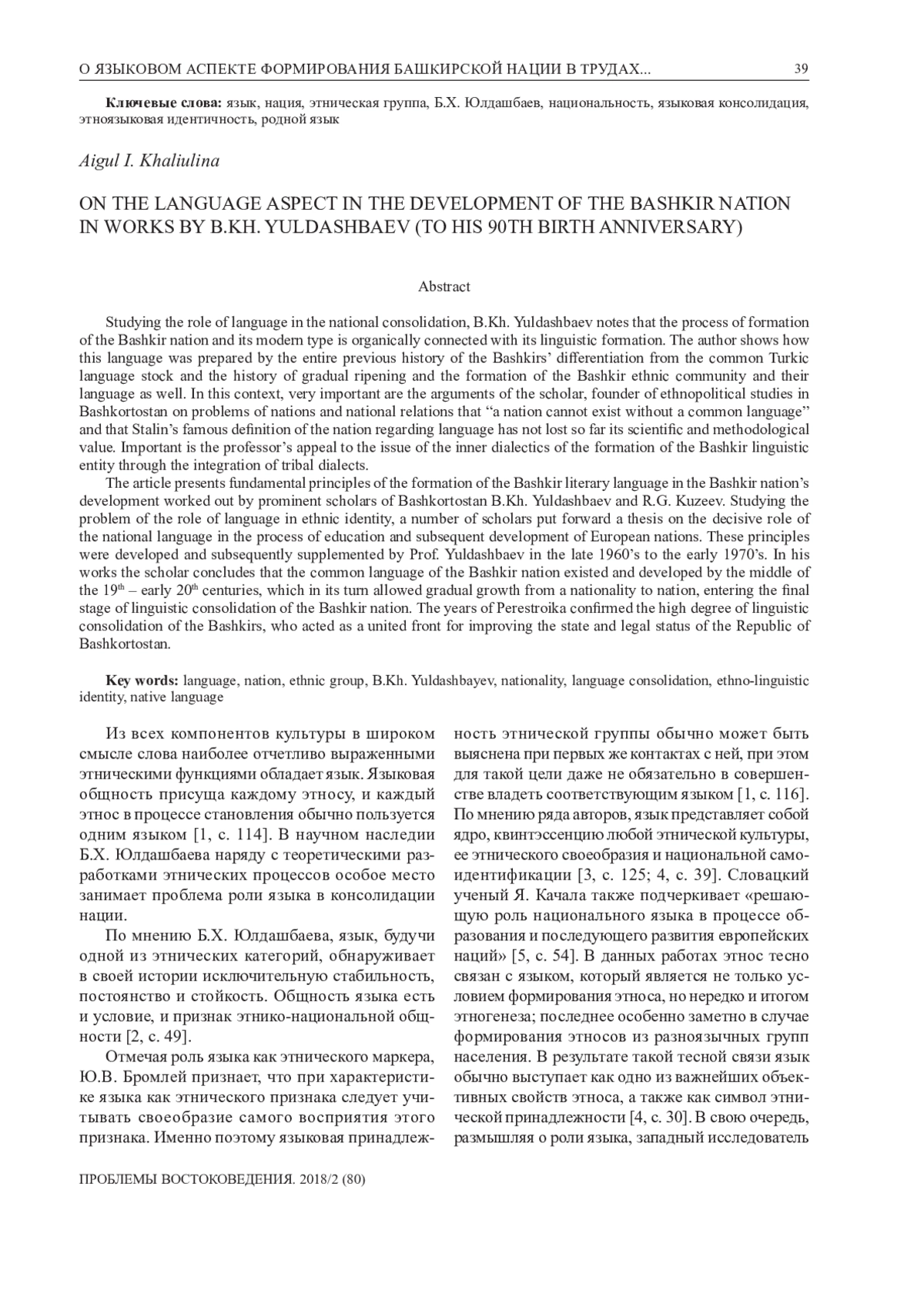 Из всех компонентов культуры в широком смысле слова наиболее отчетливо выраженными этническими функциями обладает язык. Языковая общность присуща каждому этносу, и каждый этнос в процессе становления обычно пользуется одним языком [1, с. 114]. В научном наследии Б. Х. Юлдашбаева наряду с теоретическими разработками этнических процессов особое место занимает проблема роли языка в консолидации нации