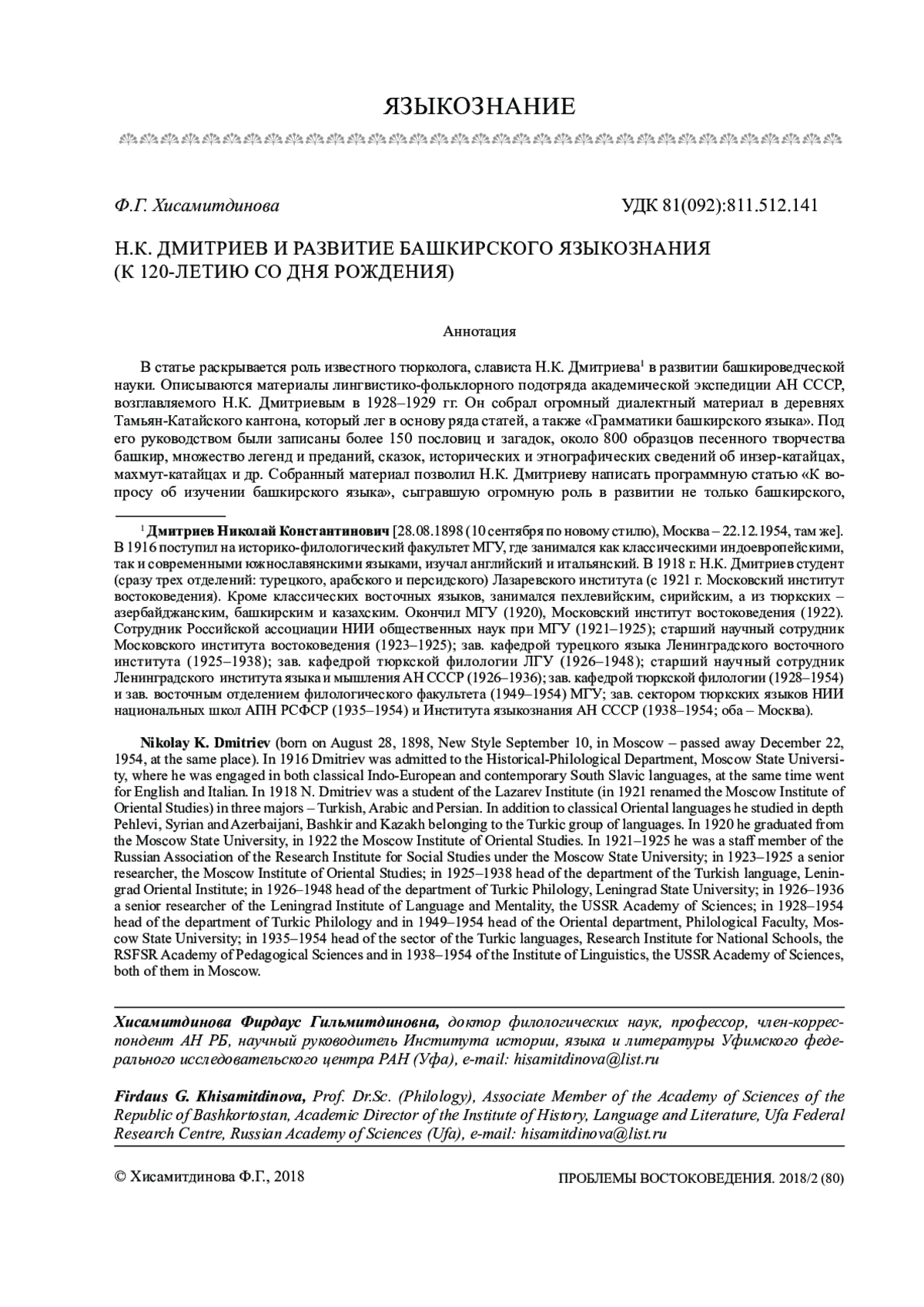 В 2018 г. мировая тюркологическая наука отмечает 120-летний юбилей выдающегося тюрколога, слависта, востоковеда, башкироведа, члена-корреспондента АН СССР (1943), действительного члена Академии педагогических наук РСФСР (1945), заслуженного деятеля науки Туркменской ССР (1950), Башкирской (1947) и Чувашской (1953) АССР, доктора филологических наук (1938), профессора Московского и СанктПетербургского университетов Николая Константиновича Дмитриева