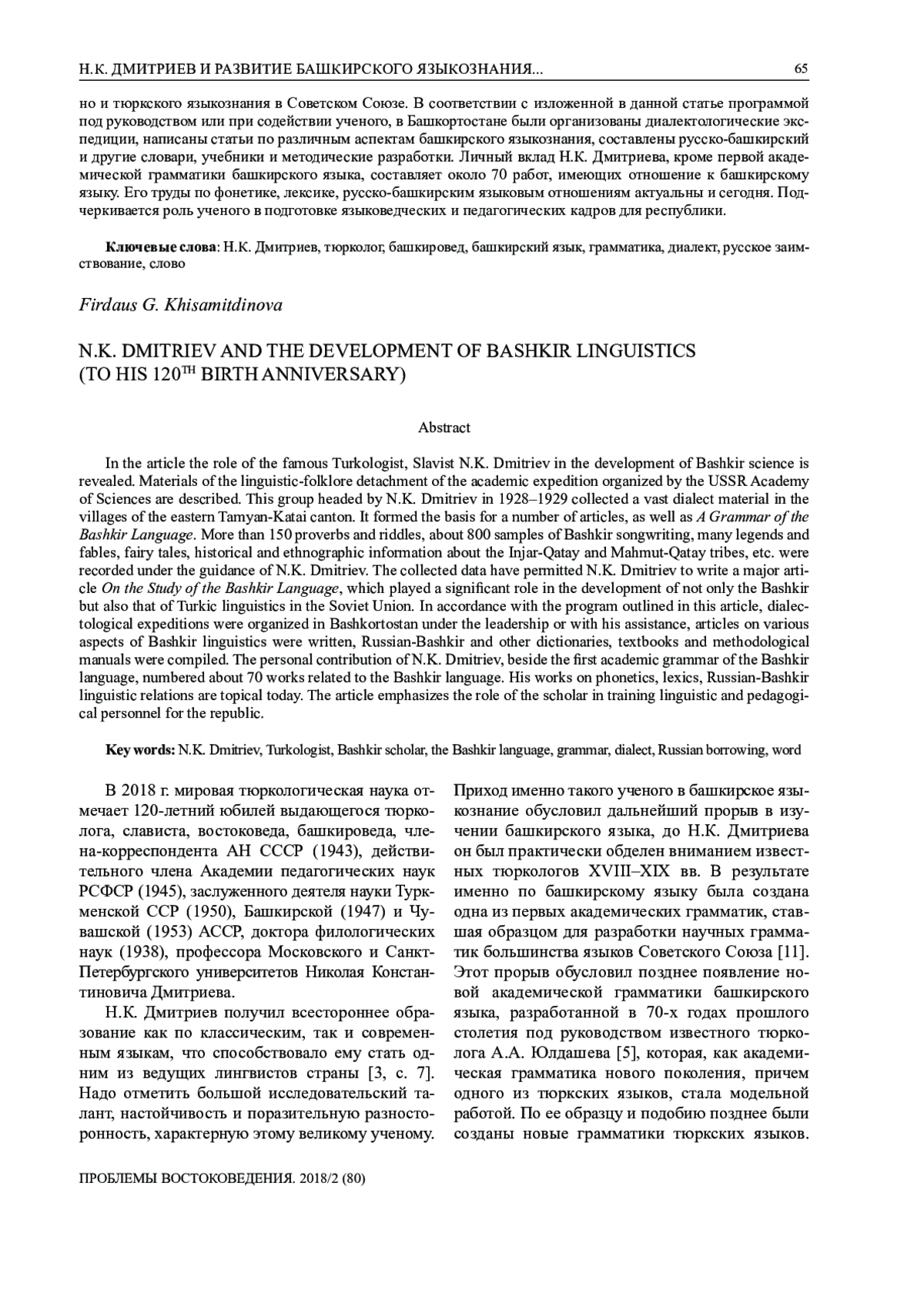 В статье раскрывается роль известного тюрколога, слависта Н. К. Дмитриева1 в развитии башкироведческой науки. Описываются материалы лингвистико-фольклорного подотряда академической экспедиции АН СССР, возглавляемого Н. К. Дмитриевым в 1928–1929 гг. Он собрал огромный диалектный материал в деревнях Тамьян-Катайского кантона, который лег в основу ряда статей, а также «Грамматики башкирского языка». Под его руководством были записаны более 150 пословиц и загадок, около 800 образцов песенного творчества башкир, множество легенд и преданий, сказок, исторических и этнографических сведений об инзер-катайцах, махмут-катайцах и др. Собранный материал позволил Н. К. Дмитриеву написать программную статью «К вопросу об изучении башкирского языка», сыгравшую огромную роль в развитии не только башкирского, но и тюркского языкознания в Советском Союзе. В соответствии с изложенной в данной статье программой под руководством или при содействии ученого, в Башкортостане были организованы диалектологические экспедиции, написаны статьи по различным аспектам башкирского языкознания, составлены русско-башкирский и другие словари, учебники и методические разработки. Личный вклад Н. К. Дмитриева, кроме первой академической грамматики башкирского языка, составляет около 70 работ, имеющих отношение к башкирскому языку. Его труды по фонетике, лексике, русско-башкирским языковым отношениям актуальны и сегодня. Подчеркивается роль ученого в подготовке языковедческих и педагогических кадров для республики