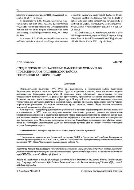 1. Аккубеков Р.Ю. Древнетюркские традиции в мусульманских эпитафиях (на примере намогильных памятников с. Саиткулово Кугарчинского района РБ) // Проблемы востоковедения. 2015. № 3 (69). С. 47-51. EDN: UMSBAX