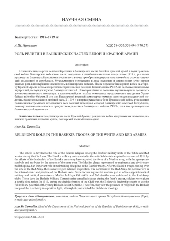 12. Ярмуллин А.Ш. Институт полковых мулл в башкирских войсках в годы Гражданской войны // Проблемы востоковедения. 2010. №3 (49). C. 76-81. EDN: RDEHTJ