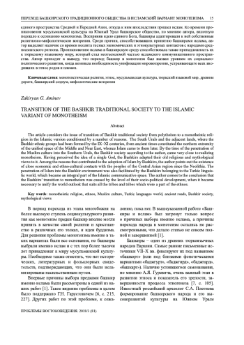 В статье рассматривается вопрос перехода башкирского традиционного общества от политеизма к монотеистической религии в исламском варианте, который обуславливается рядом причин. Южный Урал и прилегающие земли, где к IX–XI вв. сформировался башкирский этнос, издревле составляли северную оконечность единого пространства Средней и Передней Азии, откуда к ним впоследствии пришел ислам. Ко времени проникновения мусульманской культуры на Южный Урал башкирское общество, по мнению автора, вплотную подошло к осознанию монотеизма. Восприняв идею единого Бога, башкиры адаптировали к ней собственные религиозно-мифологические воззрения. Среди причин, способствовавших принятию башкирами ислама, автор выделяет наличие со времен неолита тесных экономических и этнокультурных контактов с народами среднеазиатского региона. Проникновению ислама в башкирскую среду способствовала также принадлежность их к тюркскому языковому миру, который стал неотъемлемой частью исламского коммуникативного пространства. Автор приходит к выводу, что переход башкир в монотеизм был вызван уровнем их социальнополитического развития, когда возникла необходимость унификации мировоззрения, устраивающего всех входивших в этнос родов и племен.