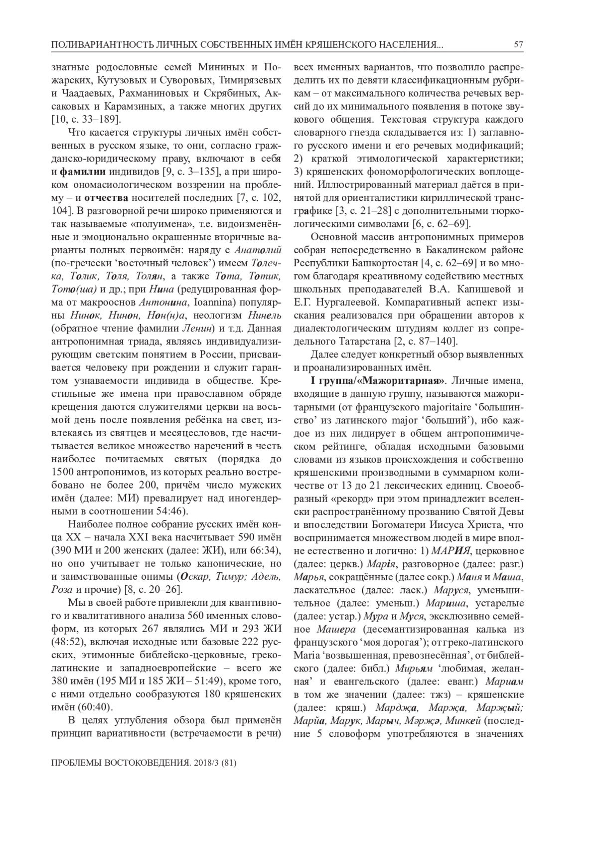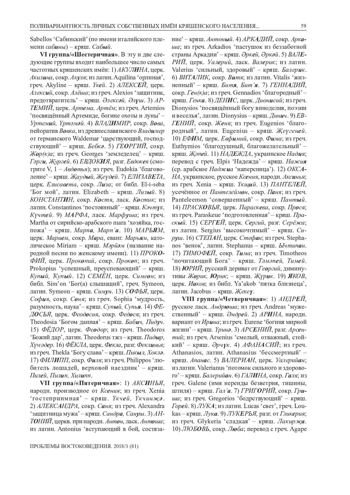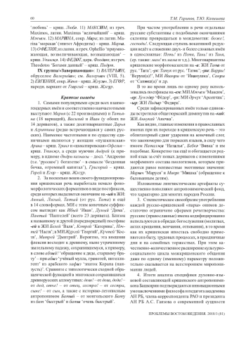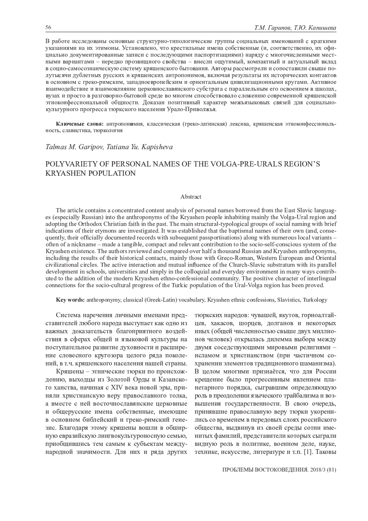 В статье проводится концентрированный контент-анализ личных имён собственных, заимствованных из восточнославянских языков (особенно русского) в антропонимикон кряшенской народности, обитающей преимущественно в Волго-Уралье и принявшей в прошлом христианскую веру православного толка В работе исследованы основные структурно-типологические группы социальных именований с краткими указаниями на их этимоны. Установлено, что крестильные имена собственные (и, соответственно, их официально документированные записи с последующими паспортизациями) наряду с многочисленными местными вариантами – нередко прозвищного свойства – внесли ощутимый, компактный и актуальный вклад в социо-самосознанческую систему кряшенского бытования. Авторы рассмотрели и сопоставили свыше полутысячи дублетных русских и кряшенских антропонимов, включая результаты их исторических контактов в основном с греко-римским, западноевропейским и ориентальным цивилизационными кругами. Активное взаимодействие и взаимовлияние церковнославянского субстрата с параллельным его освоением в школах, вузах и просто в разговорно-бытовой среде во многом способствовало сложению современной кряшенской этноконфессиональной общности. Доказан позитивный характер межъязыковых связей для социальнокультурного прогресса тюркского населения Урало-Приволжья