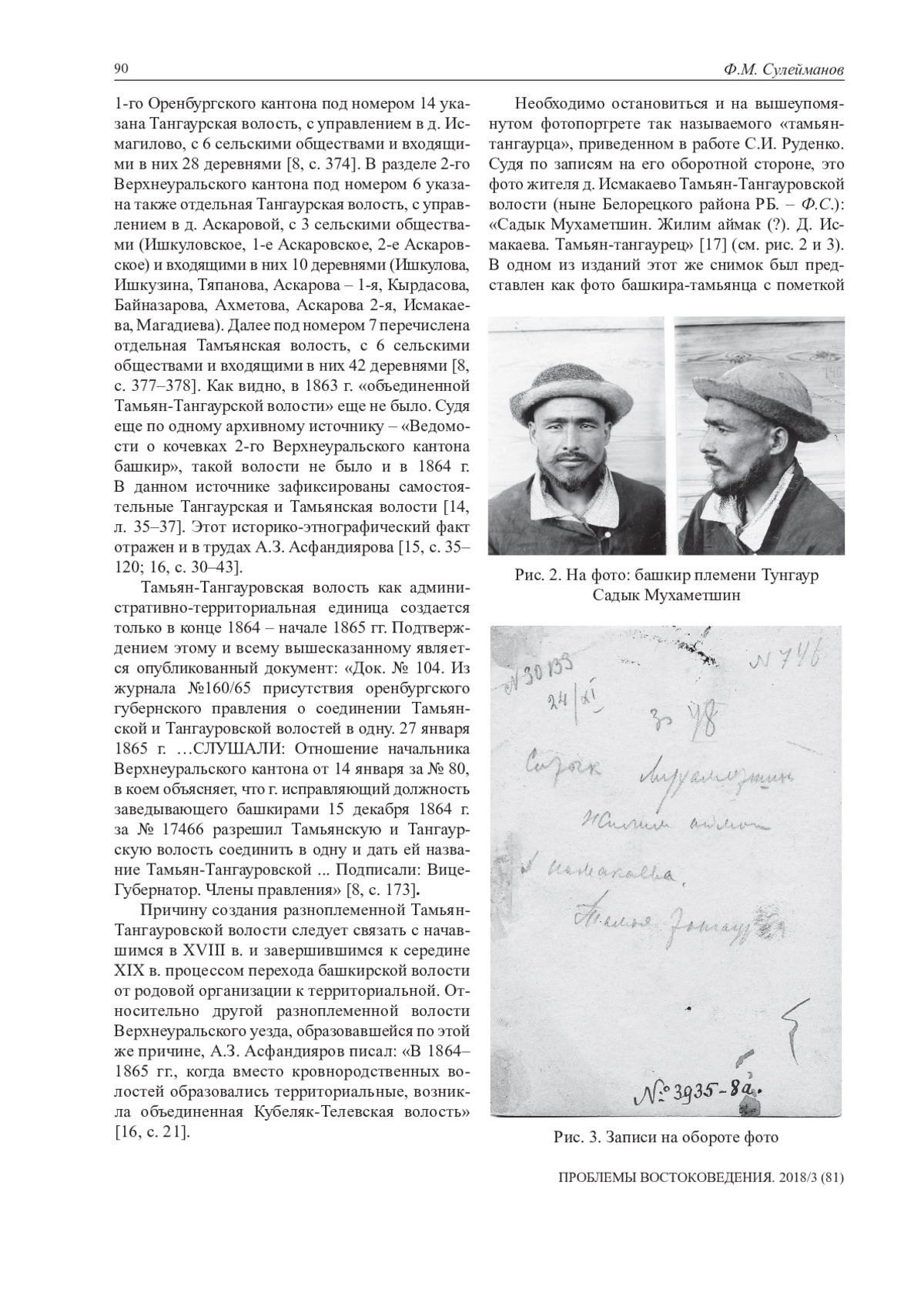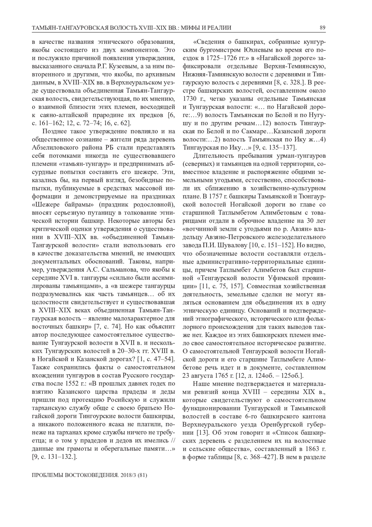 В статье проводится анализ опубликованных и архивных материалов, доказывающих несостоятельность утверждения в историографии о существовании в XVIII–XIX вв. объединенной Тамьян-Тангаурской волости. Причиной начала объединения исследователями тамьянцев и тунгауров под общее название «тамьянтангаурцы», очевидно, явился тот факт, что к началу XX в. деревни северной части тунгауров – урман-тунгауров и соседних с ними тамьянцев находились в составе одной административно-территориальной единицы – Тамьян-Тангауровской волости. Данное обстоятельство привело к ошибочному восприятию известным этнографом С. И. Руденко представителей двух разных племен – тамьянцев и тунгауров как жителей одной этнической общности. Длительное пребывание урман-тунгауров (северных) и тамьянцев на одной территории, совместное владение и распоряжение общими земельными угодьями способствовало их сближению в хозяйственно-культурном плане. Но вплоть до середины XIX в. эти волости составляли отдельные этнические и административнотерриториальные единицы. Совместная хозяйственная деятельность, земельные сделки не могут выступать основанием для объединения их в одну этническую единицу. Подтверждений и фактов этнографического, исторического или фольклорного происхождения для таких выводов также не существуют. Каждое из этих башкирских племен имело свое самостоятельное историческое развитие. До середины XIX в. объединенной на этнической основе Тамьян-Тангаурской волости не было. Волость под названием Тамьян-Тангауровская, куда вошли селения тамьянцев и урман-тунгауров (северных), образуется лишь 15 де кабря 1864 г. по распоряжению властей как административно-территориальная единица, а не в результате этнического соединения двух башкирских племен
