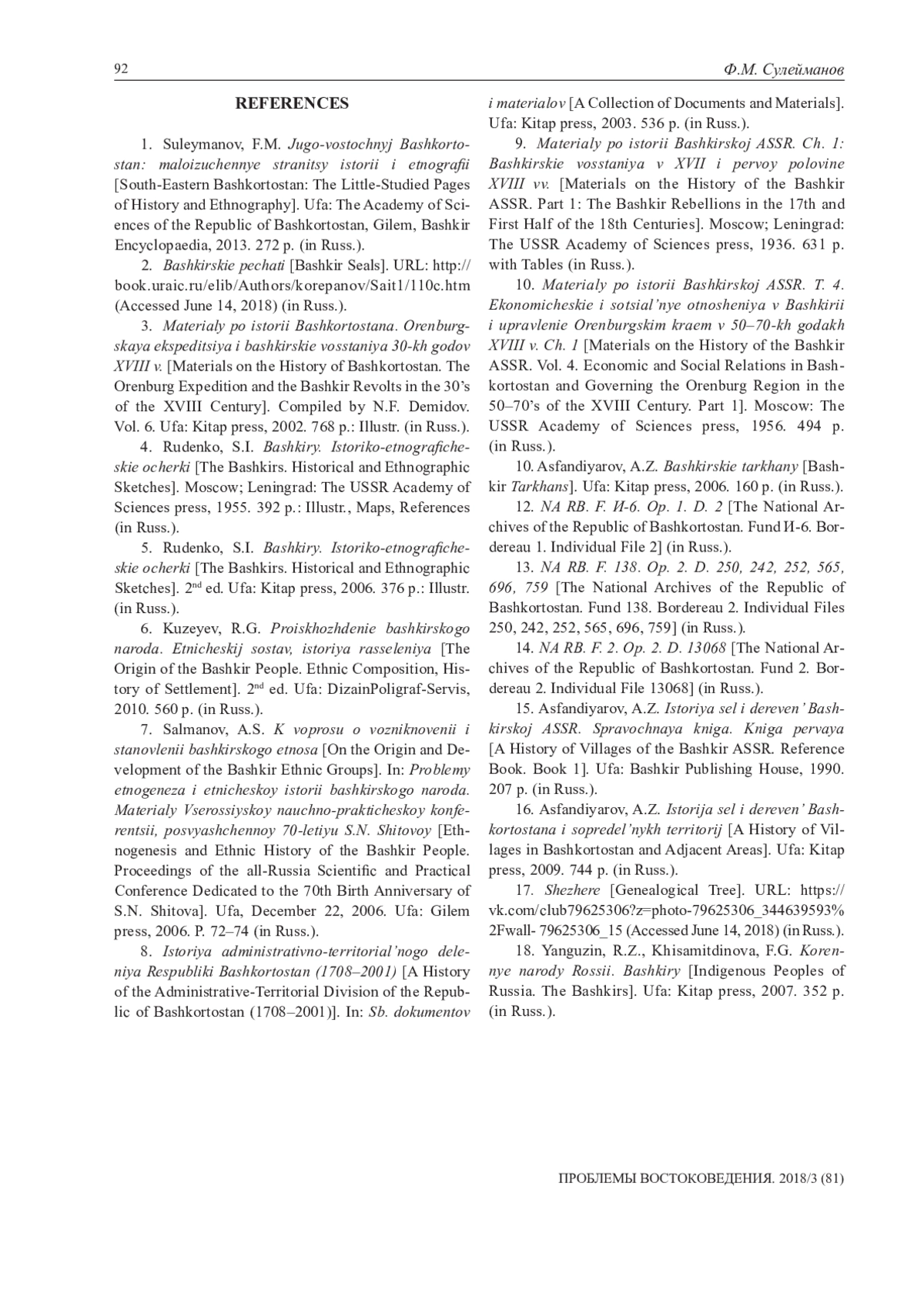 1. Сулейманов Ф.М. Юго-восточный Башкортостан: малоизученные страницы истории и этнографии. Уфа: АН РБ, Гилем, Башк. энциклопедия, 2013. 272 с. EDN: YRZYKI