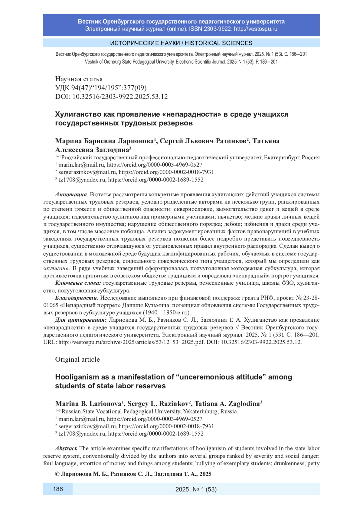 31. Захаровский Л. В., Разинков С. Л. Учебные заведения системы Государственных трудовых резервов в СССР в 1941-1954 годах: адаптация к миграционному воздействию (по материалам Свердловской области) // Научный диалог. 2021. № 1. С. 267-285. DOI: 10.24224/2227-1295-2021-1-267-285 EDN: VRBYSE