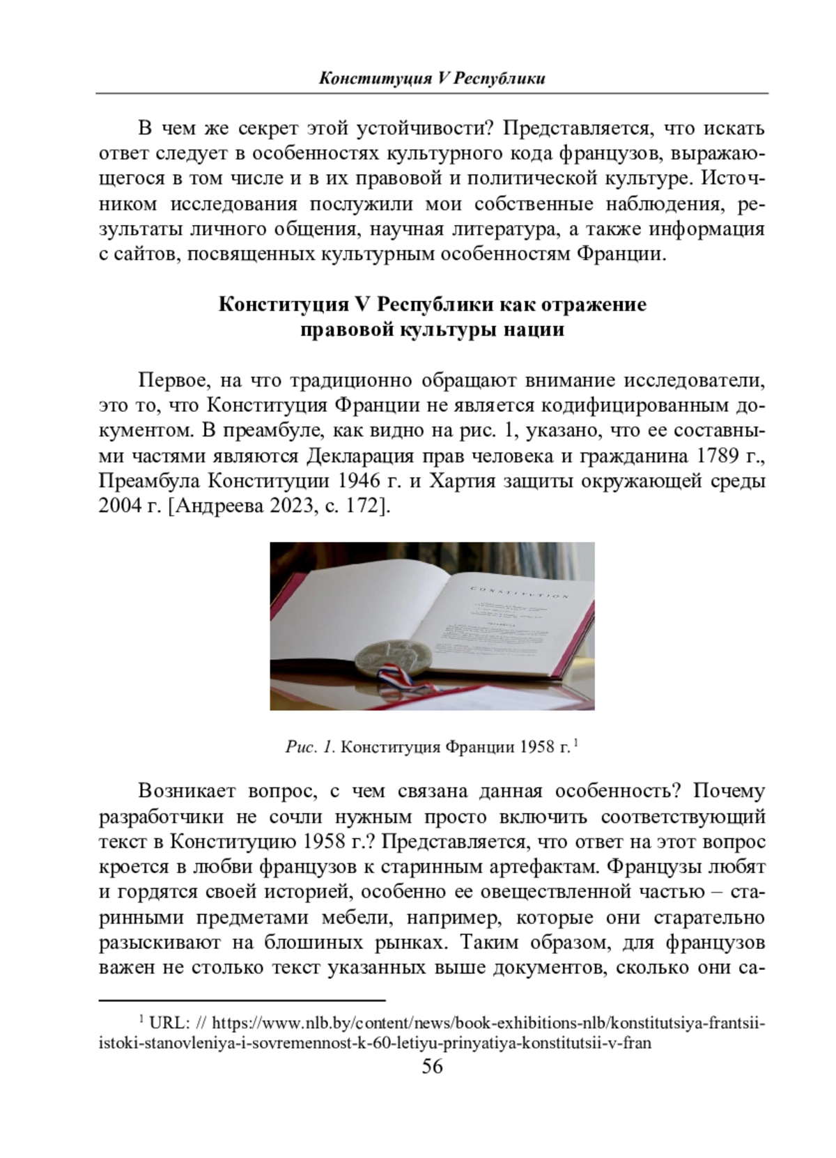 1. Andreeva, G. N. “Konstitutsiya kak vazhnaia sostavnaya chast’ kul’turnogo nasledia” [The Constitution as an important part of the cultural heritage]. *Vestnik kul’turologii*, no. 4(107), 2023, pp. 163–178. (In Russ.). DOI: 10.31249/hoc/2023.04.09