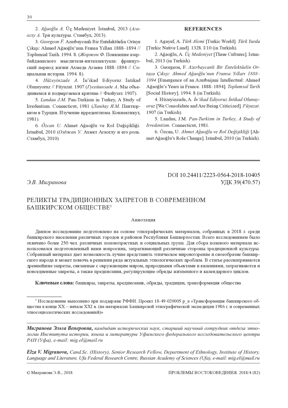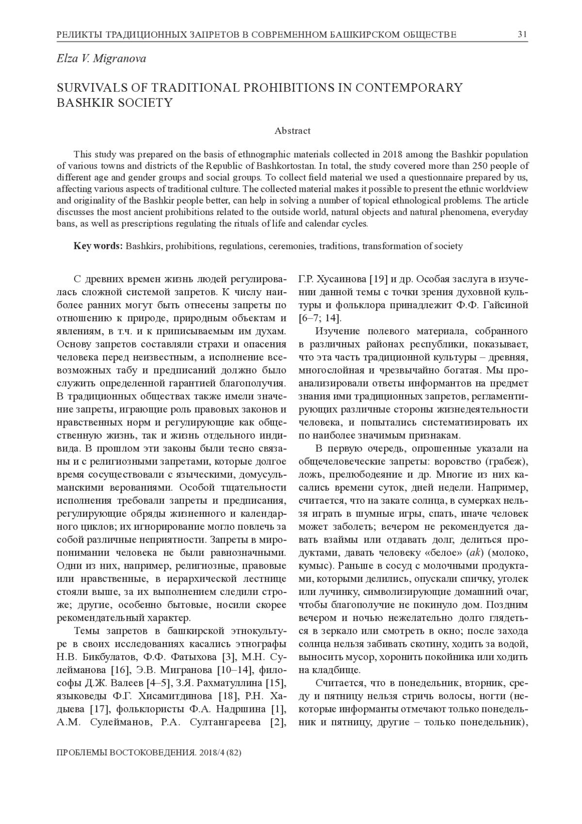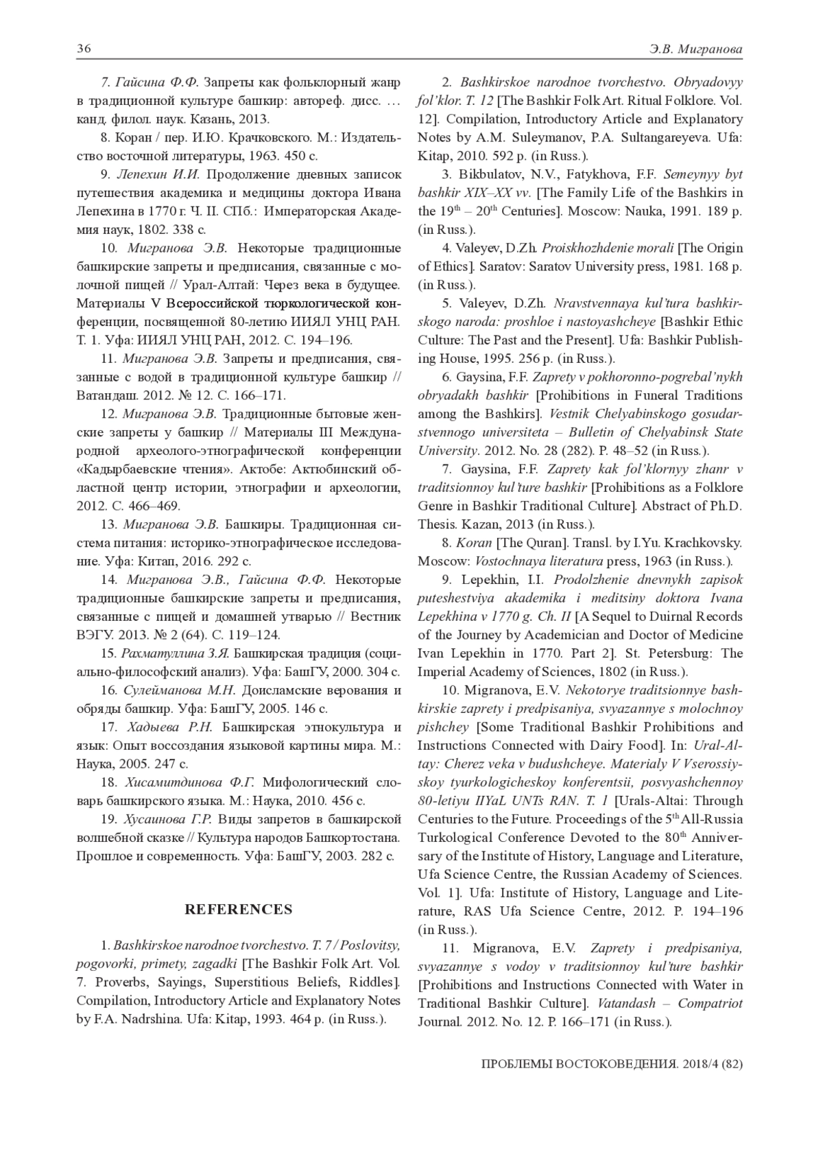 12. Мигранова Э.В. Традиционные бытовые женские запреты у башкир // Материалы III Международной археолого-этнографической конференции «Кадырбаевские чтения». Актобе: Актюбинский областной центр истории, этнографии и археологии, 2012. С. 466-469. EDN: YPRVKP