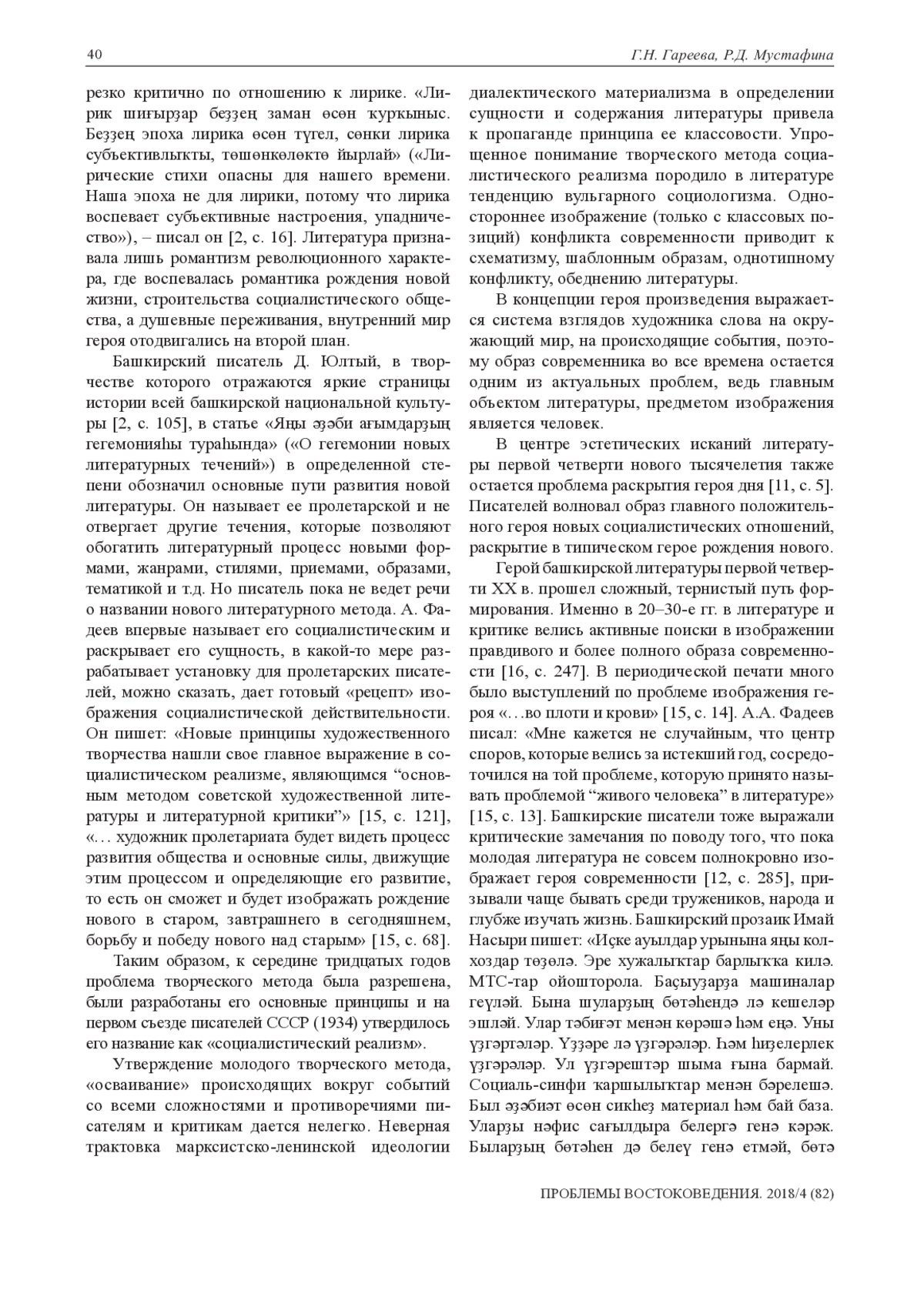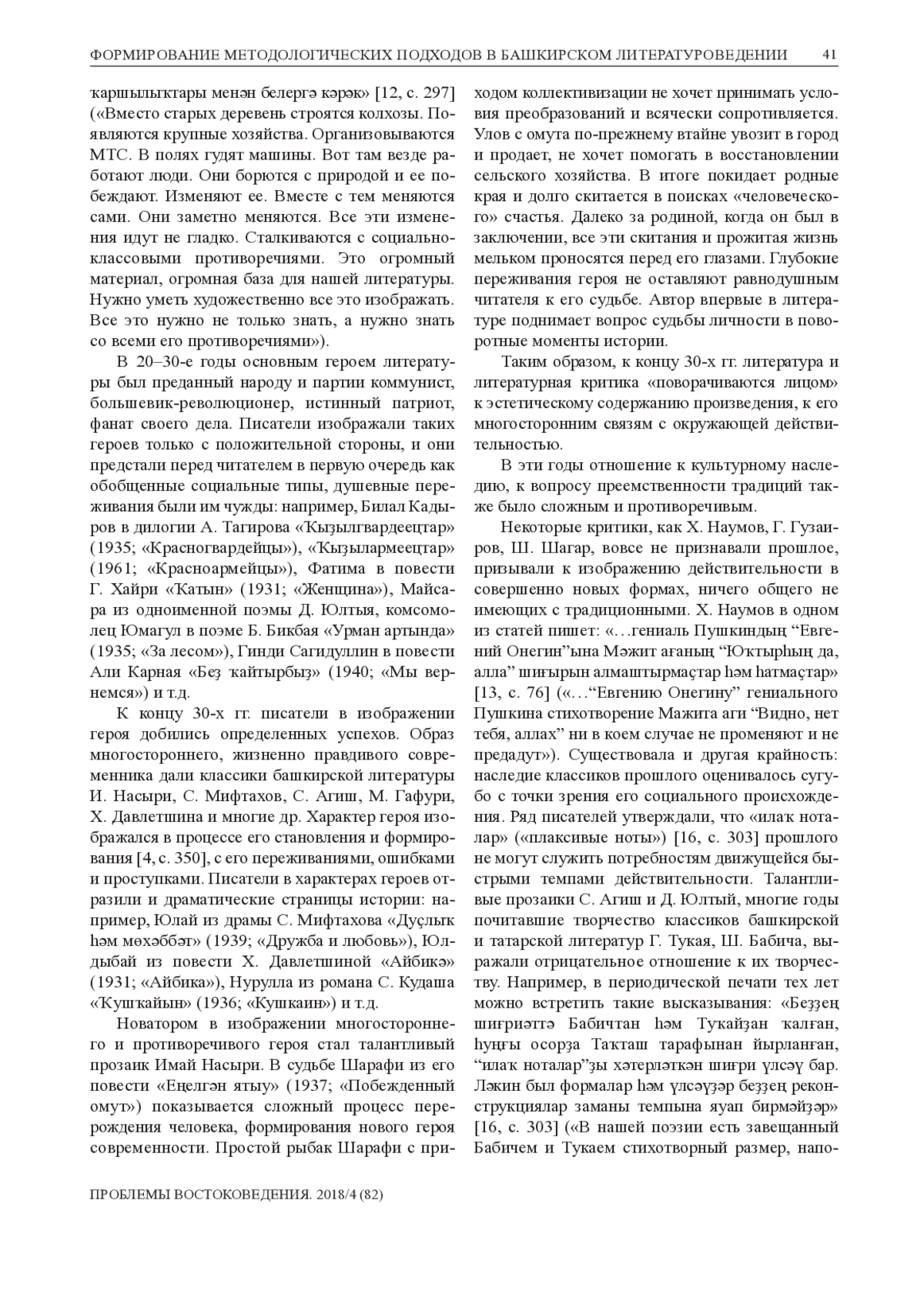 В 20–30-е гг. ХХ в. перед литературой (пролетарской, как называли ее писатели тех лет) и критикой стояли задачи определения путей их развития. После 1917 г. начинается новый – самый сложный и противоречивый этап становления башкирской советской национальной литературы и критической мысли, которая, в свою очередь, начала формироваться еще в последней четверти XIX в. благодаря многогранным поискам видных башкирских просветителей М. Уметбаева и Р. Фахретдинова [7, c. 148–157; 9, c. 135–153; 10, c. 367, 370–376].