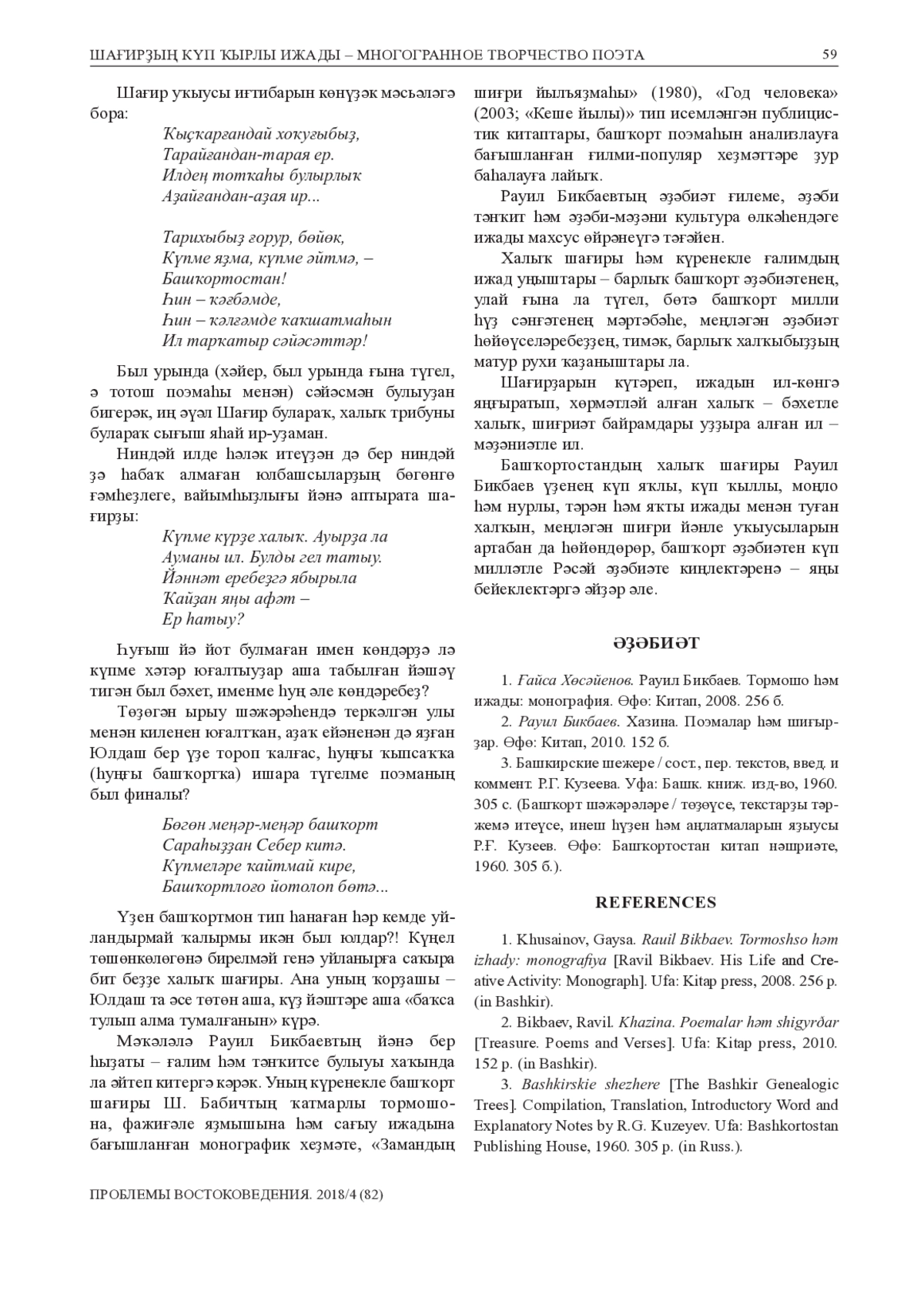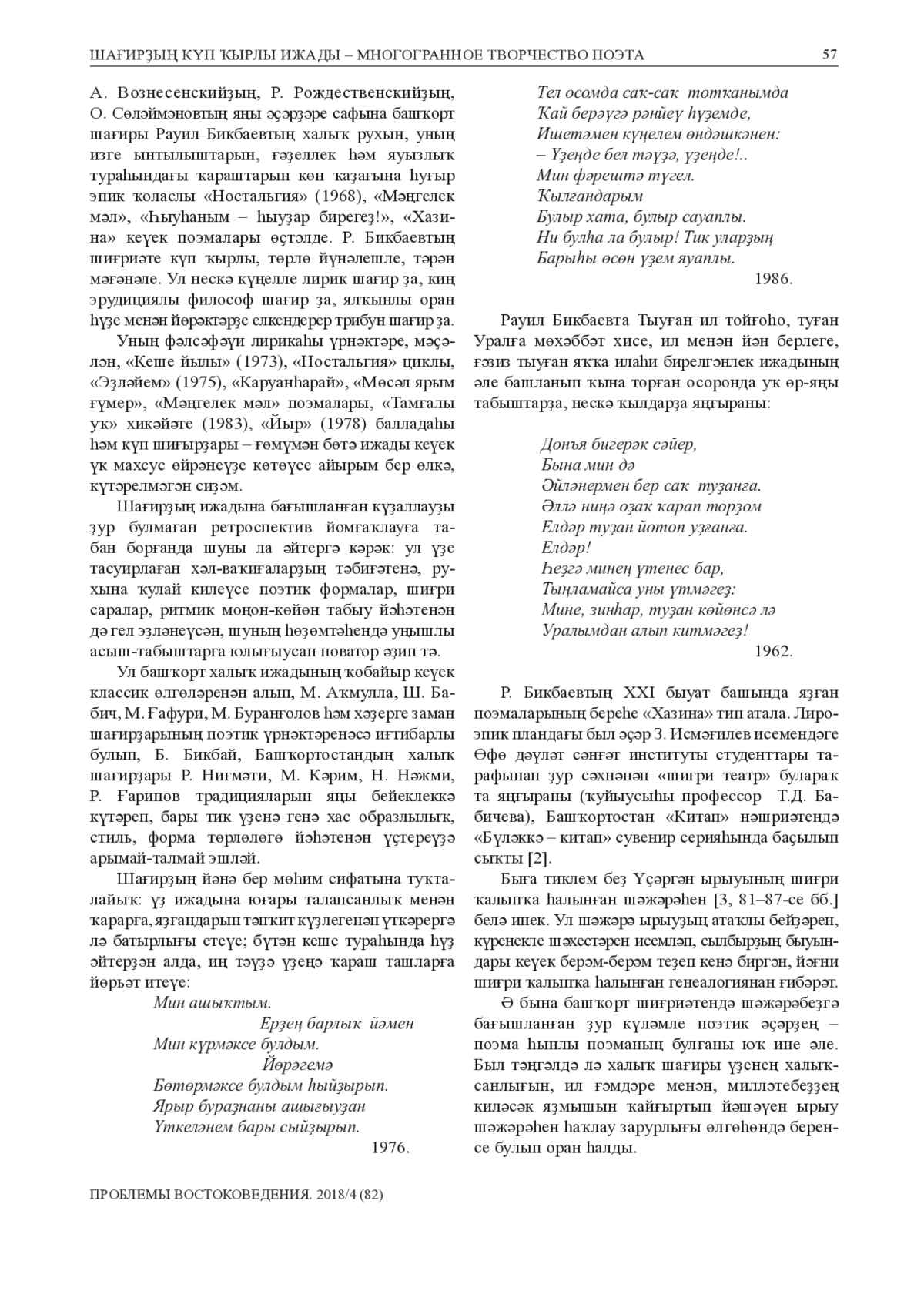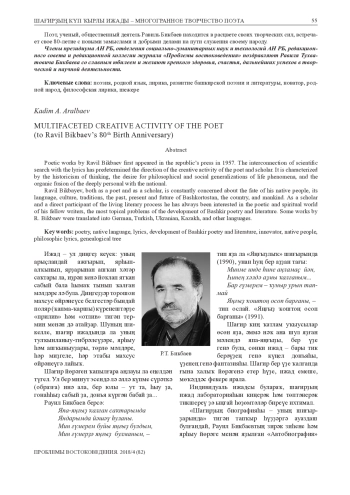 Поэтические произведения Равиля Бикбаева1 начали активно публиковаться в республиканской печати с 1957 г. В 1962 году в журнале «Ағиҙел» («Агидель») вышла его первая поэма «Вокзал», в которой он во весь голос заявил о себе как о зрелом, самобытном, талантливом поэте лирико-философского мироощущения и склада. В 1964 г. вышла в свет первая поэтическая книга Р. Т. Бикбаева «Дала офоҡтары» («Степные дали»), за ней последовали другие, принесшие ему заслуженное признание как в мире поэзии, так и в мире науки. Соединение научных поисков с лирикой предопределило направление всего творчества поэта и ученого, оно характеризуется историзмом мышления, стремлением к философским и социальным обобщениям жизненных явлений, органическим слиянием глубоко личного с общенародным, общенациональным. Равиля Бикбаева и как поэта, и как ученого постоянно волнует судьба родного народа, его языка, культуры, традиций, прошлое, настоящее и будущее Башкортостана, страны, всего человечества. Наиболее острые проблемы нашего неустроенного бытия нашли отражение в его знаменитом поэтическом монологе «Халҡыма хат» (1989; «Письмо моему народу»), в поэмах «Һыуһаным – һыуҙар бирегеҙ!» (1989; «Утолить бы жажду!»), «Баҙар балтаһы» (1993; «Базарный топор») и др. Как ученого-исследователя и непосредственного участника живого литературного процесса, его всегда интересовали поэтический и духовный мир своих собратьев по перу, предшественников и современников, наиболее актуальные проблемы развития башкирской поэзии и литературы. «Время. Поэт. Народ» (1986), «Эволюция современной башкирской поэзии» (1991), «Шайхзада Бабич: жизнь и творчество» (1995), «Шағир һүҙе – шағир намыҫы» (1997; «Слово поэта – совесть поэта») – таков далеко не полный перечень его научных исследований по литературоведению и литературной критике. Отдельные произведения его переведены на немецкий, турецкий, украинский, казахский, якутский, чувашский, каракалпакский, алтайский и др. языки.