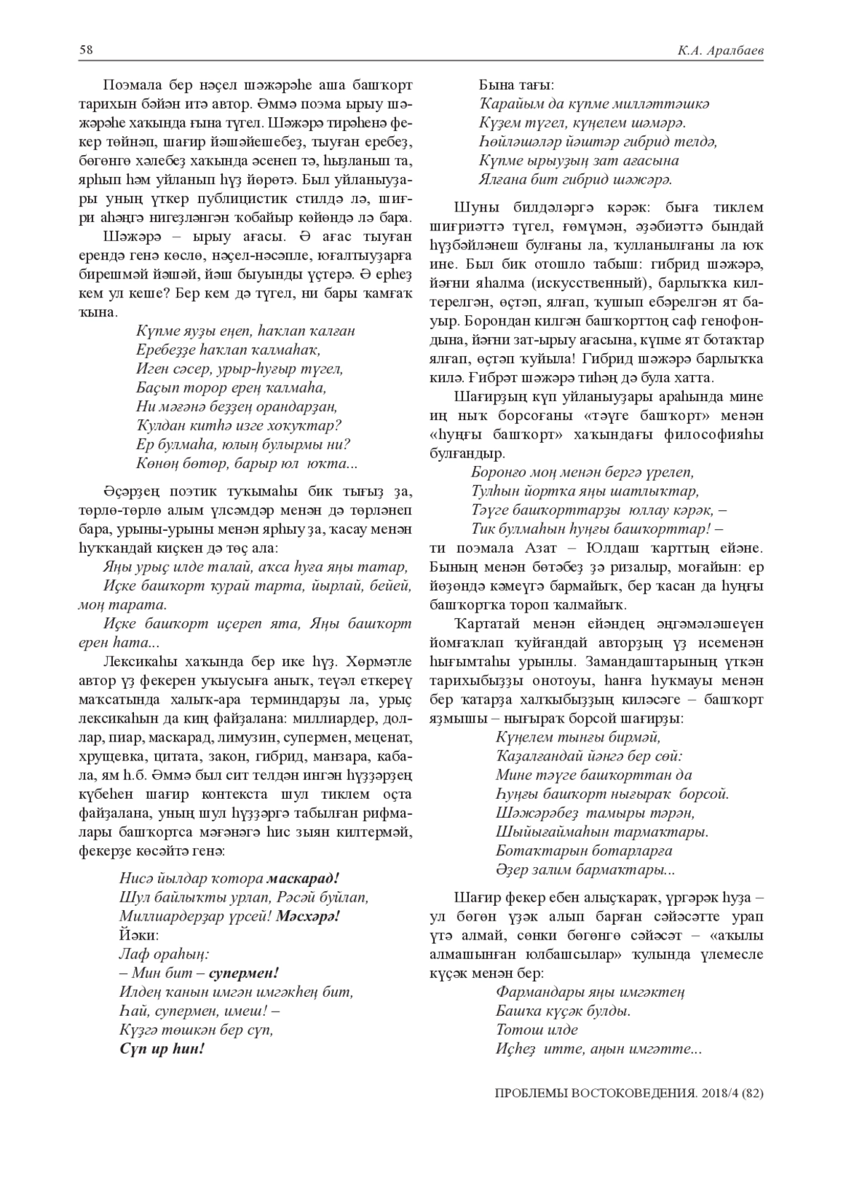 В статье исследуются русизмы, входящие в состав сказочных зачинов, обозначающие военный чин или должность. Автор указывает, что данное явление обусловлено тем, что после вхождения башкирских племен в состав Русского государства начинается регулярная служба башкир в постоянном русском войске и древнетюркская военная лексика заменяется русскими терминами. Многие русские заимствования появились при строительстве металлургических заводов на Южном Урале и Зауралье в местах, богатых залежами руды и минералов. Общие потребности, обмен социально-экономическими, культурными реалиями и простое общение людей были причиной появления заимствованных слов, которые, в свою очередь, подвергались значительным фонетическим изменениям в соответствии с традиционными законами фонологической структуры башкирского языка и, следовательно, заимствования адаптированы к звуковой модели исконной лексики. Некоторые русизмы полностью адаптированы по орфоэпическим законам живого общенародного языка и фонетической специфике башкирских диалектов. Перечисленные в статье заимствования были в основном подвержены расширению гласных и палатализации согласных; свистящий согласный с преобразуется в спирант һ. Данные явления присущи южному и восточному диалектам башкирского языка. В основе исследования лежит выявление связи исконного слова и заимствования, приведены определенные пояснения первичной и вторичной семы слова, объяснены причины фонетической адаптации иноязычной лексики в живой башкирской речи, установлены пути проникновения иноязычных лексических единиц в фольклорные тексты