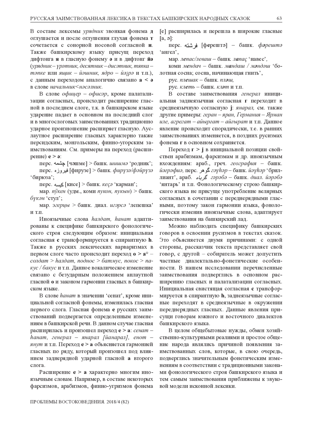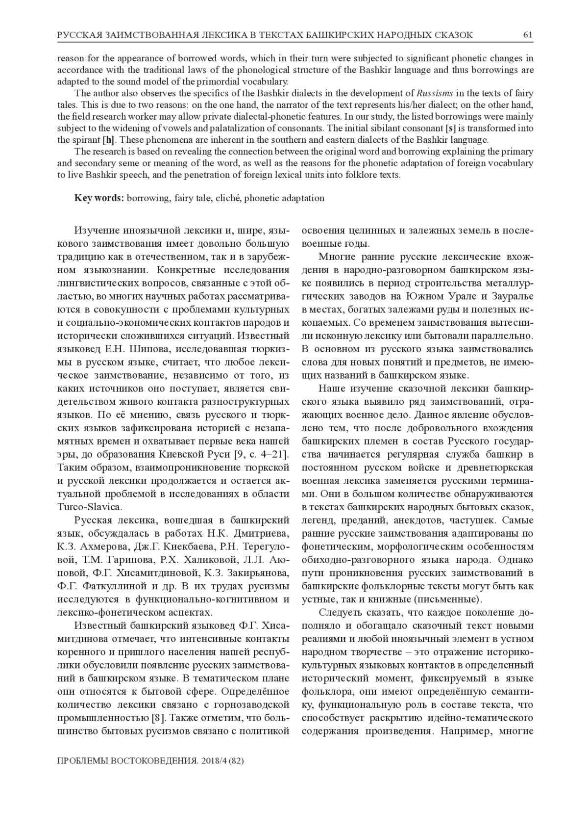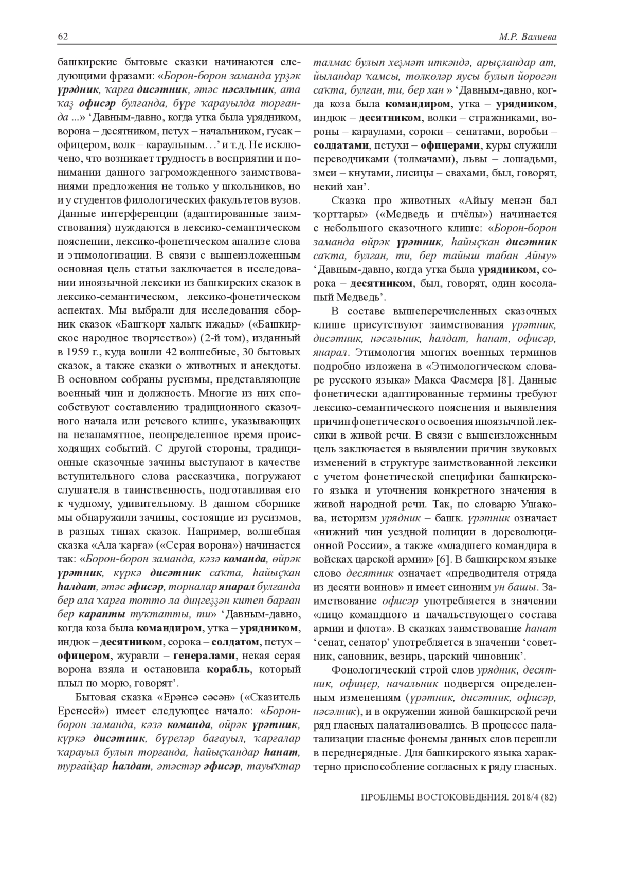 В статье исследуются русизмы, входящие в состав сказочных зачинов, обозначающие военный чин или должность. Автор указывает, что данное явление обусловлено тем, что после вхождения башкирских племен в состав Русского государства начинается регулярная служба башкир в постоянном русском войске и древнетюркская военная лексика заменяется русскими терминами. Многие русские заимствования появились при строительстве металлургических заводов на Южном Урале и Зауралье в местах, богатых залежами руды и минералов. Общие потребности, обмен социально-экономическими, культурными реалиями и простое общение людей были причиной появления заимствованных слов, которые, в свою очередь, подвергались значительным фонетическим изменениям в соответствии с традиционными законами фонологической структуры башкирского языка и, следовательно, заимствования адаптированы к звуковой модели исконной лексики. Некоторые русизмы полностью адаптированы по орфоэпическим законам живого общенародного языка и фонетической специфике башкирских диалектов. Перечисленные в статье заимствования были в основном подвержены расширению гласных и палатализации согласных; свистящий согласный с преобразуется в спирант һ. Данные явления присущи южному и восточному диалектам башкирского языка. В основе исследования лежит выявление связи исконного слова и заимствования, приведены определенные пояснения первичной и вторичной семы слова, объяснены причины фонетической адаптации иноязычной лексики в живой башкирской речи, установлены пути проникновения иноязычных лексических единиц в фольклорные тексты