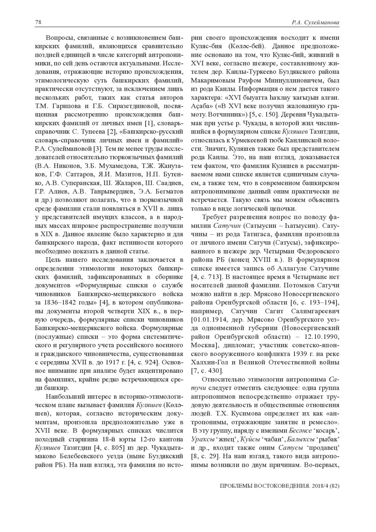 Вопросы, связанные с возникновением башкирских фамилий, являющихся сравнительно поздней единицей в числе категорий антропонимики, по сей день остаются актуальными. Исследования, отражающие историю происхождения, этимологическую суть башкирских фамилий, практически отсутствуют, за исключением лишь нескольких работ, таких как статья авторов Т. М. Гарипова и Г. Б. Сиразетдиновой, посвященная рассмотрению происхождения башкирских фамилий от личных имен [1], словарьсправочник С. Тупеева [2], «Башкирско-русский словарь-справочник личных имен и фамилий» Р. А. Сулеймановой [3]. Тем не менее труды исследователей относительно тюркоязычных фамилий (В. А. Никонов, З. Б. Мухамедова, Т. Ж. Жанузаков, Г. Ф. Саттаров, Я. И. Мазитов, Н. П. Бутенко, А. В. Суперанская, Ш. Жаларов, Ш. Саадиев, Г. Р. Алиев, a. b. Танрывердиев, Э. А. Бегматов и др.) позволяют полагать, что в тюркоязычной среде фамилии стали появляться в XVII в. лишь у представителей имущих классов, а в народных массах широкое распространение получили в XIX в. Данное явление было характерно и для башкирского народа, факт истинности которого необходимо показать в данной статье