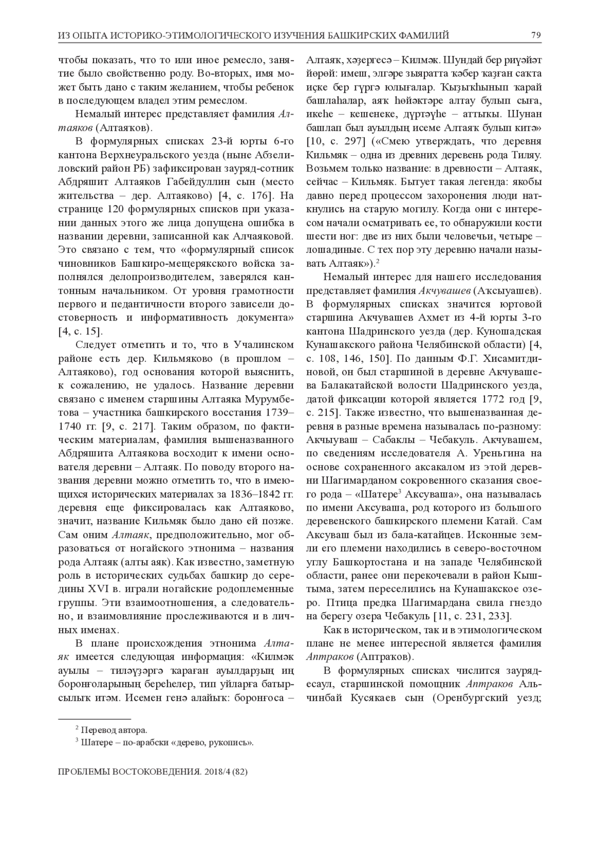 В статье рассматриваются вопросы, связанные с возникновением некоторых башкирских фамилий �Vii– �i� вв. Предметом исследования явились фамилии, редко встречающиеся среди башкир, в связи с чем представляющие большой интерес в плане их этимологии. Следует отметить, что анализируемые в статье фамилии были рассмотрены впервые в истории башкирской антропонимики на основе материалов из научного издания «Документы и материалы по истории Башкирского народа (1836–1842). Формулярные списки о службе чиновников Башкирско-мещерякского войска за 1836–1842 годы» (2012; 2014). Анализ редких фамилий позволил сделать вывод об их восхождении к личным именам: Сатучи, Куляш (Куляс), Алтаяк, Акчуваш, Аптрак, Сырым. Установлено, что носители некоторых личных имен известны как основатели населенных пунктов, в которых они проживали (Алтаяков, Акчувашев, Аптраков). Носители рассмотренных нами фамилий, зафиксированных в формулярных списках, являются потомками этих личностей