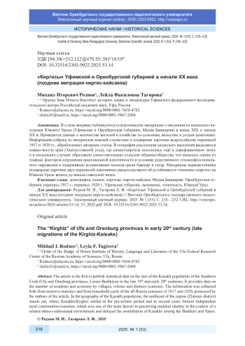 В статье впервые публикуются статистические материалы о численности казахского населения Южного Урала (Уфимская и Оренбургская губернии, Малая Башкирия) в конце XIX и начале XX в. Приводятся данные о количестве жителей и хозяйстве по селениям, волостям и уездам (кантонам). Информация собрана из материалов земской статистики и подворных карточек всероссийских переписей 1917 и 1920 гг., обработанных авторами статьи. В географии расселения казахского населения выделяется северо-восток края (Златоустовский уезд), где казахи/киргизы поселились ещё в дореформенную эпоху и в нескольких случаях образовали самостоятельные сельские общины/общества, что являлось одним из главных факторов сохранения национальной идентичности в условиях родственного этноконфессионального окружения и задерживало ассимиляцию казахов среди башкир и татар. Материалы первоисточника (подворных карточек двух переписей) однозначно свидетельствуют об устойчивости этнонима «киргиз» на Южном Урале вплоть до начала советской эпохи.