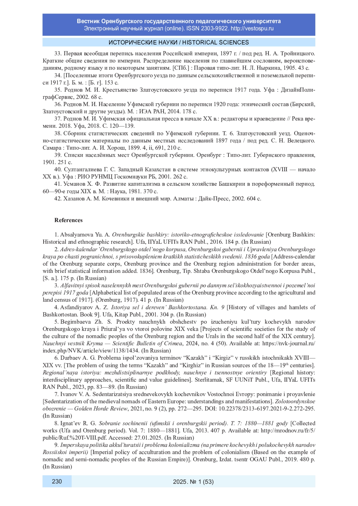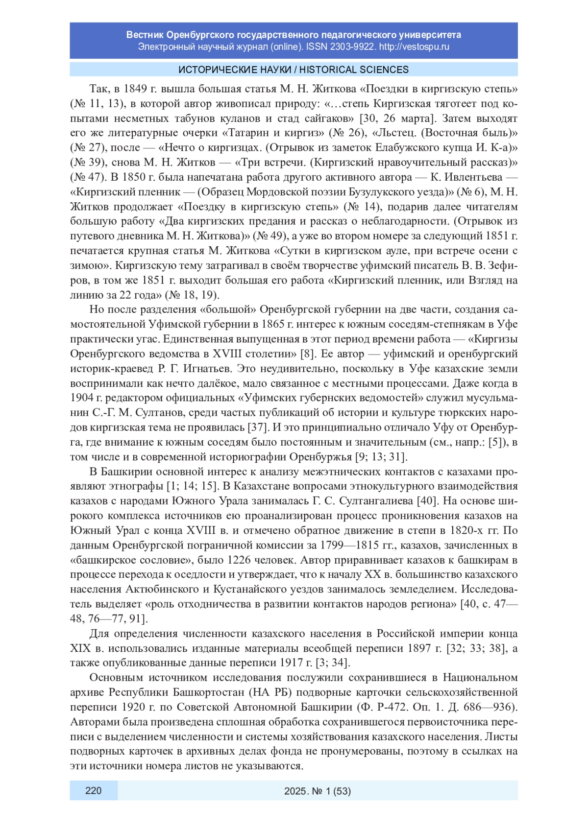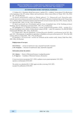 5. Бегимбаева Ж. С. Проекты научных обществ по изучению культуры кочевых народов Оренбургского края и Приуралья во второй половине XIX века // Научный вестник Крыма. 2024. № 4 (50). URL: https://nvk-journal.ru/index.php/NVK/article/view/1138/1434.
