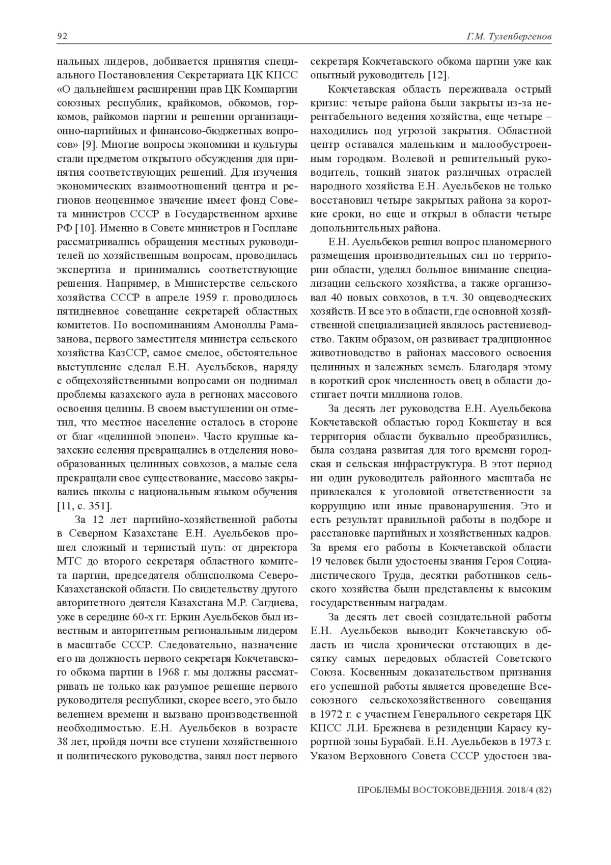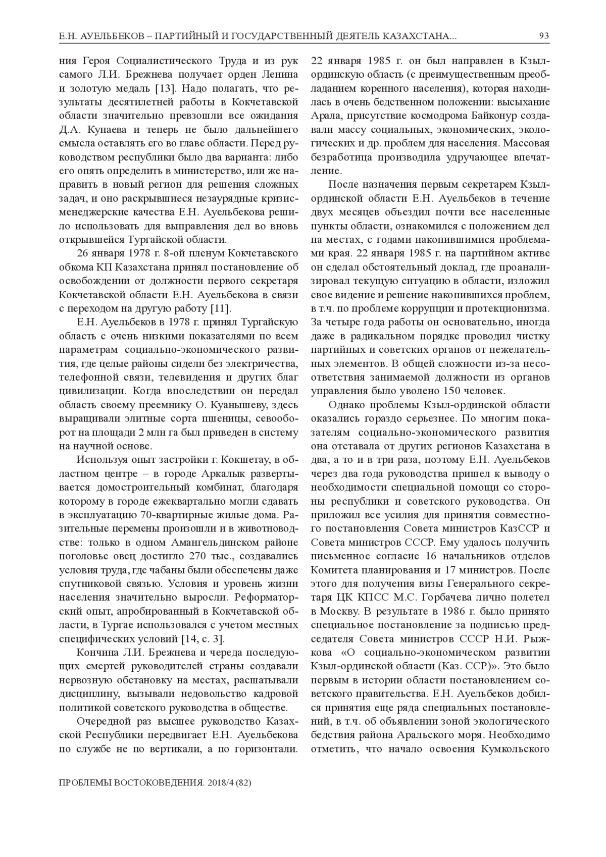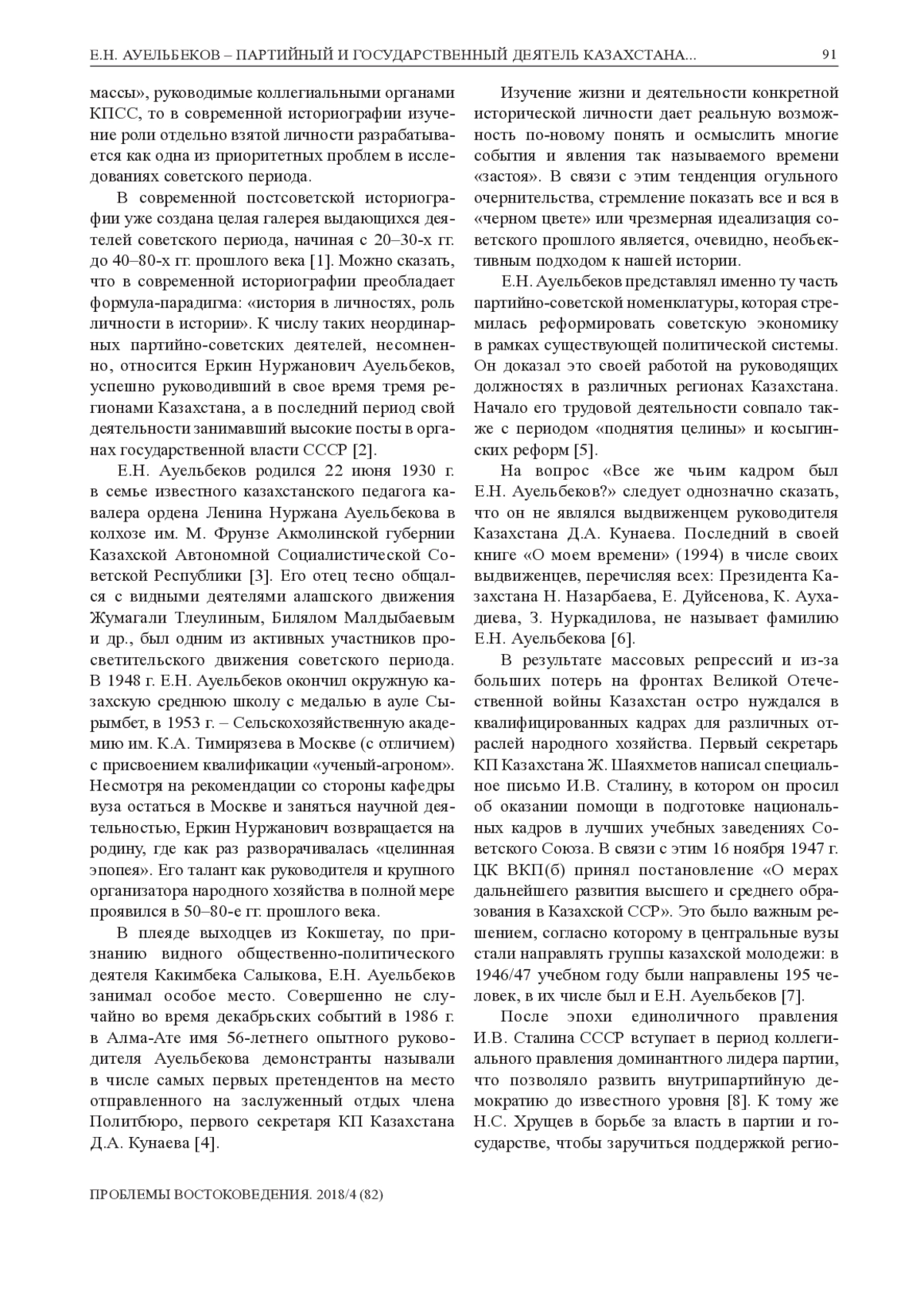 В новейшей истории Казахстана и в истории постсоветских республик в целом изучение жизни и деятельности политических персоналий советской эпохи занимает важное место. В современных геополитических условиях многократно возрастает роль исторических личностей, т. к. активное действие или наоборот бездействие человека может определить историческую судьбу целой страны и перспективы ее экономического и политического развития на длительный исторический период. Деятельность Еркина Нуржановича Ауельбекова приходится на 50–90-е гг. ХХ в., когда за пределами Советского Союза произошли важные геополитические изменения, в то же время внутри страны происходили неоднозначные процессы. В статье автор, опираясь на новые архивные и иные материалы, на примере жизни и деятельности одного из ярких и интересных представителей советской номенклатуры – Еркина Нуржановича Ауельбекова показывает реформаторские возможности части советских лидеров в духе косыгинских реформ