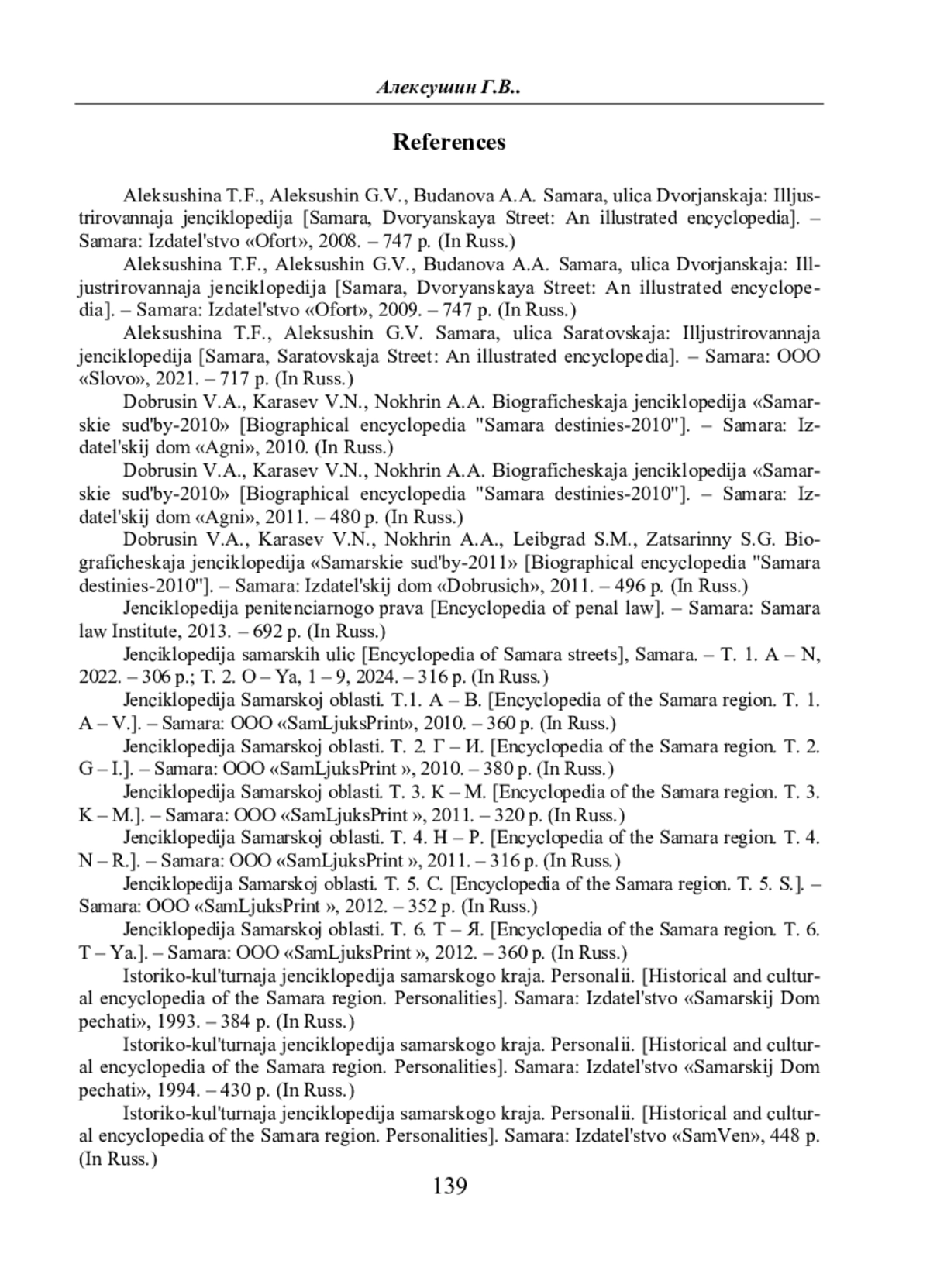 1. Aleksushina, T. F., Aleksushin, G. V., Budanova, A. A. *Samara, ulica Dvorjanskaja: Illjustrirovannaja jenciklopedija* [Samara, Dvoryanskaya Street: An illustrated encyclopedia]. Samara: Izdatel’stvo «Ofort», 2008. 747 p. (In Russ.)
