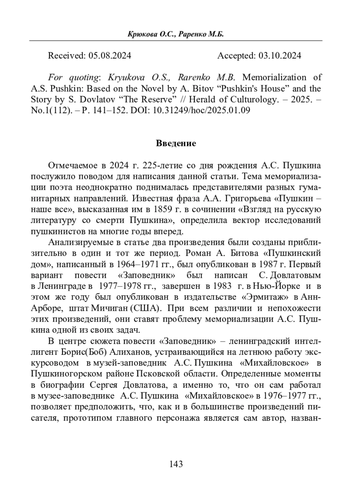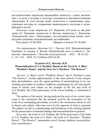 Пушкина: по роману А. Битова «Пушкинский дом» и повести С. Довлатова «Заповедник» // Вестник культурологии. – 2025. – No 1(112). –